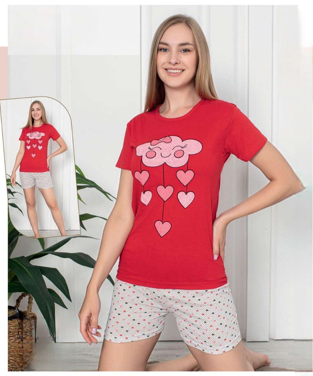 Дамска пижама от две части с щампа . Горнището е с къс ръкав, обло деколте . Долнището е с къс крачол.