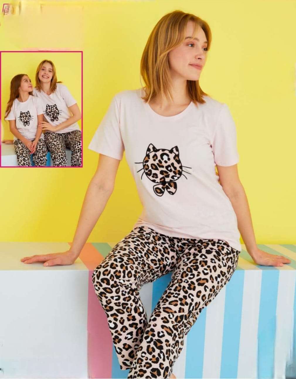 Дамска пижама с къс ръкав . Горнището е с къс ръкав,с обло деколте , щампа коте. Долнището е с дълъг крачол и е без маншет .
