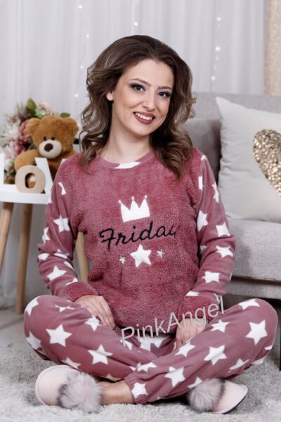 Топла дамска пижама в две части . Изработена от висококачествен полар. С апликация – надпис и щампа бели точки . Долнището е без маншет.