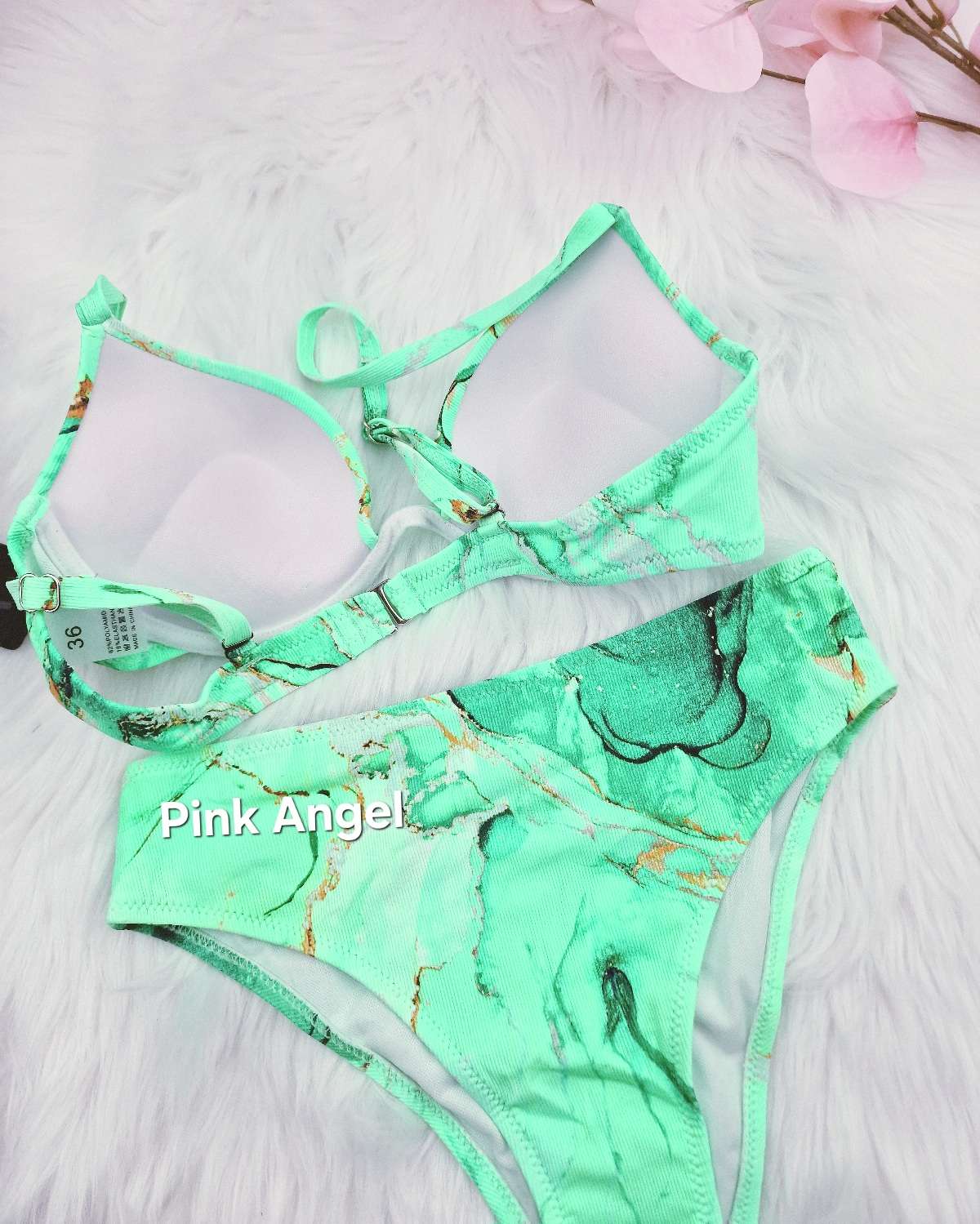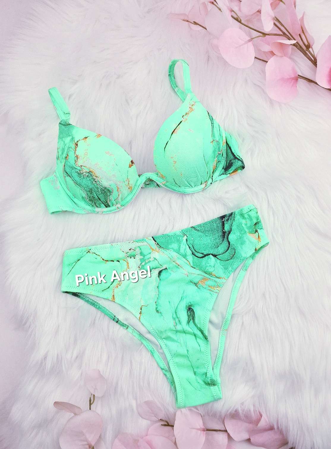 Дамски бански от две части със задно закопчаване. Горнището е с голям PUSH UP ефект и е с банели. Регулиращи се презрамки . Долнището е по-изрязана бикина с висока талия.