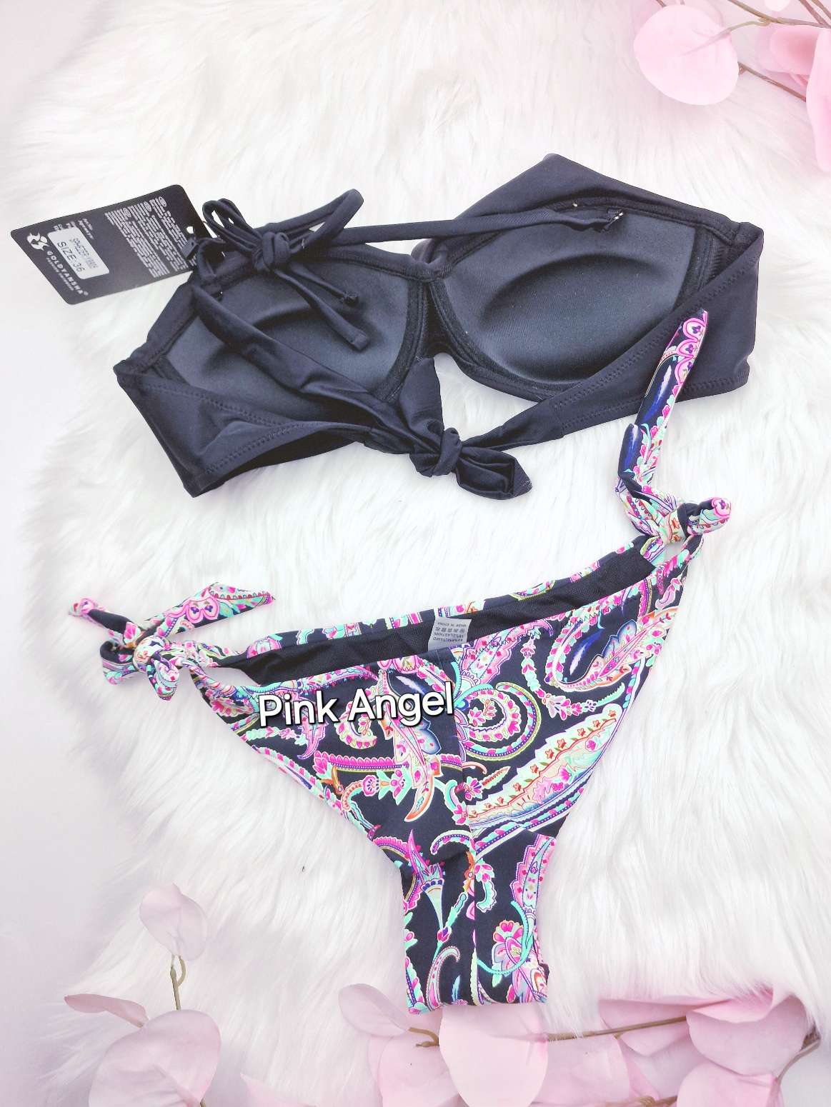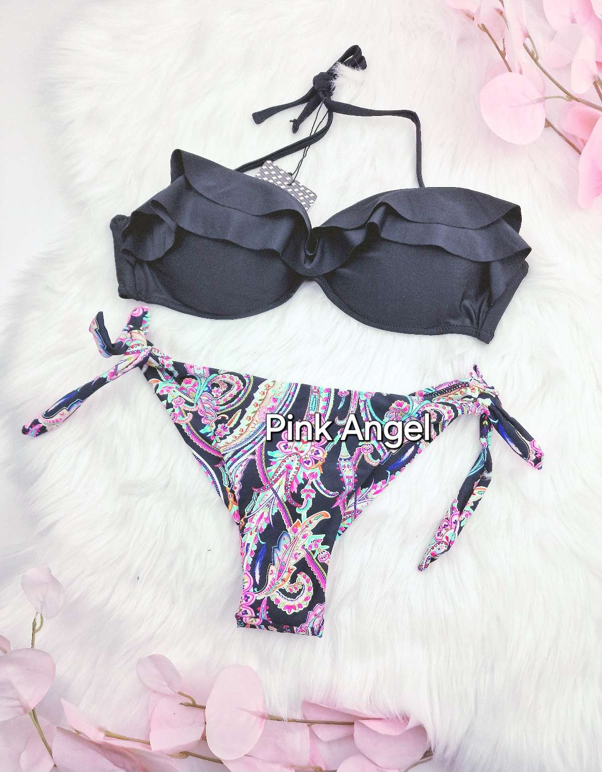 Дамски бански от две части със задно завръзване. Горнището е с голям PUSH UP ефект и е с банели. Регулиращи се, свалящи се презрамки и харбале за украшение. Долнището е бразилка с регулираща се талия.