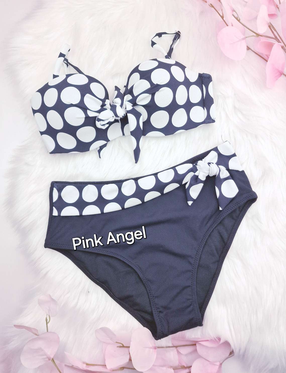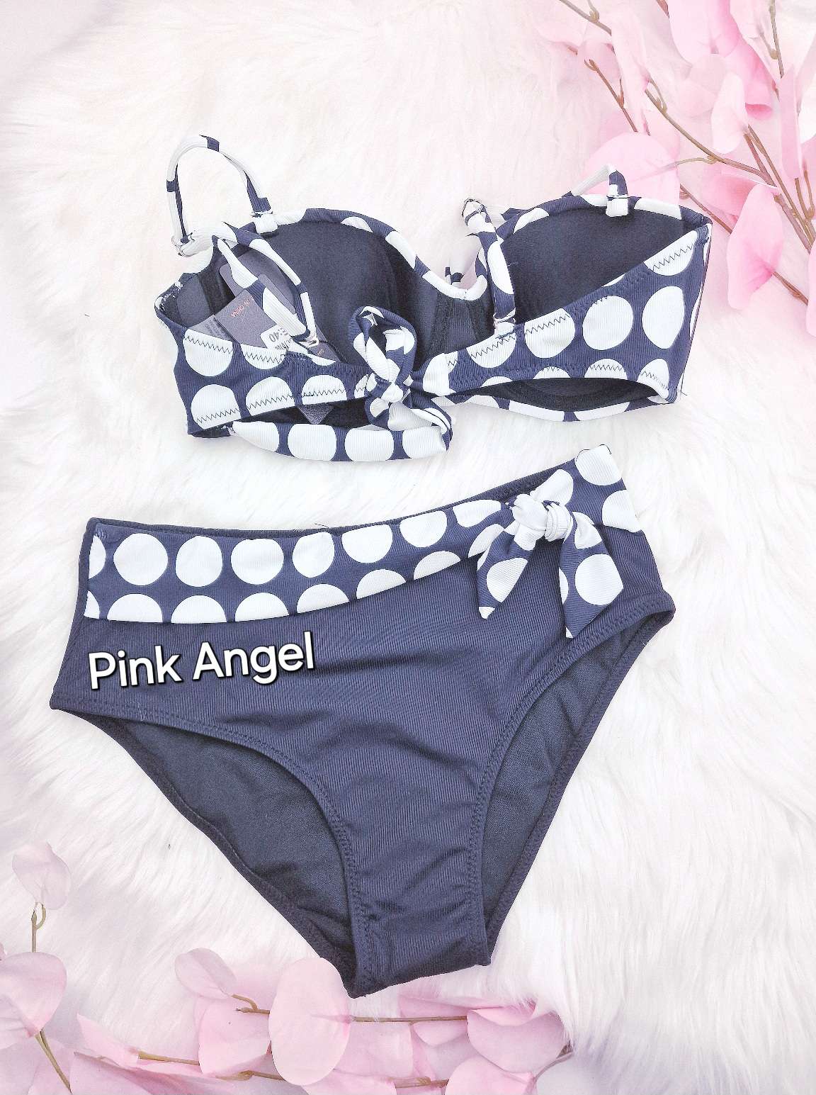 Дамски бански от две части. Горнището е с твърди, оформени чашки и банели. Със задно завръзване и регулиращи се, свалящи се презрамки. Долнището е бикина със средно висока талия.