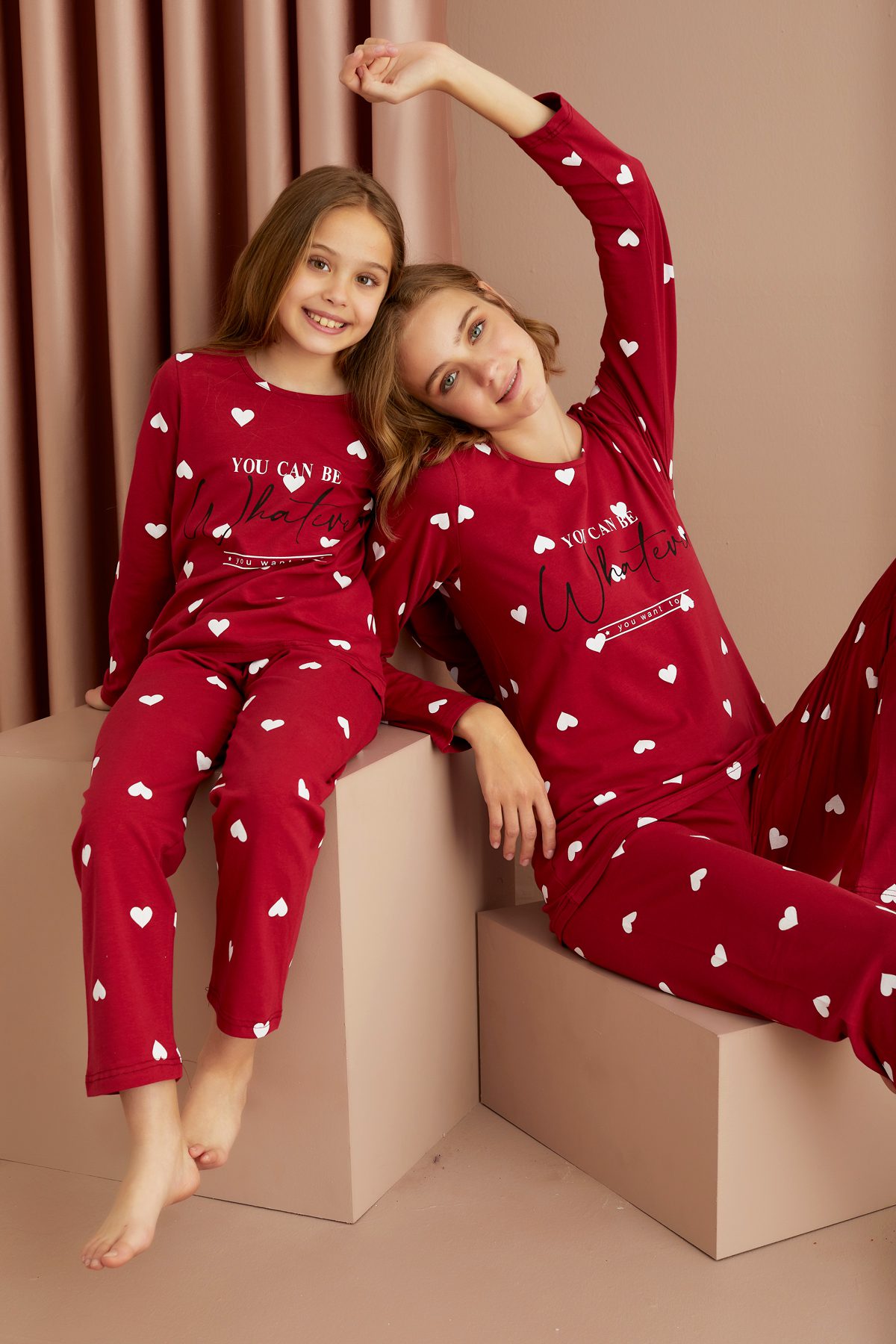 Памучна пижама от две части. Горнището е с дълъг ръкав  и щампа надпис  . Долнището е с дълъг крачол.