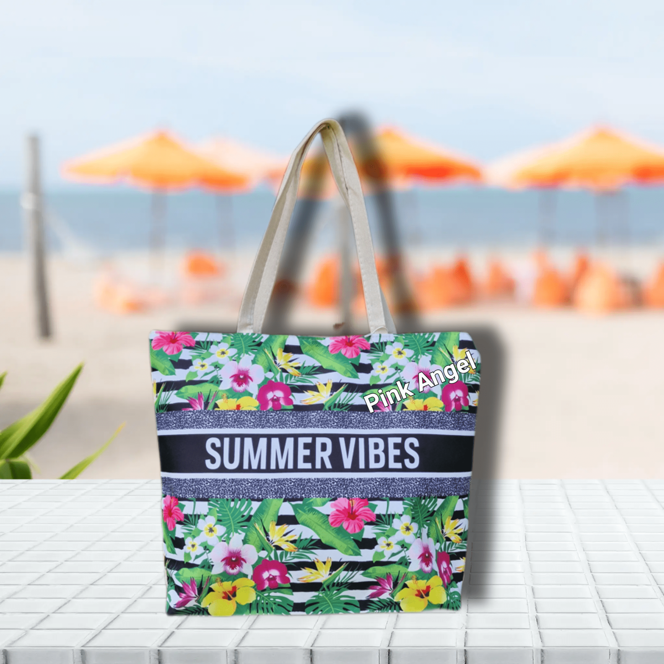 Плажна чанта – текстил. Закопчава се с цип, хастара е от полиестер. С вътрешно малко джобче.