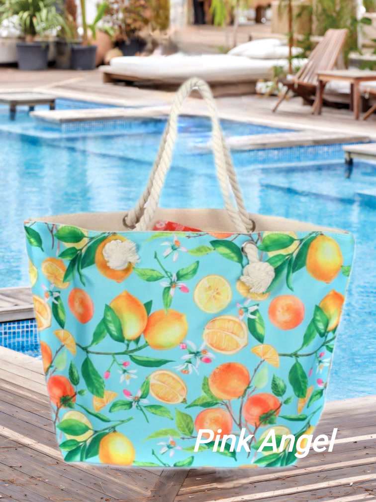 Плажна чанта с дръжки от въжета. Закопчава се с копче, хастара е от полиестер. Чантата е текстилна с весела лятна щампа..