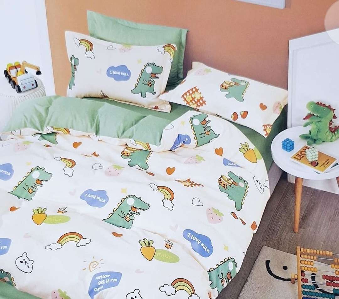 Материя:фин памук . Цвят на чаршафа, плика и калъфките – ЕДНАКЪВ – екрю на динозаври