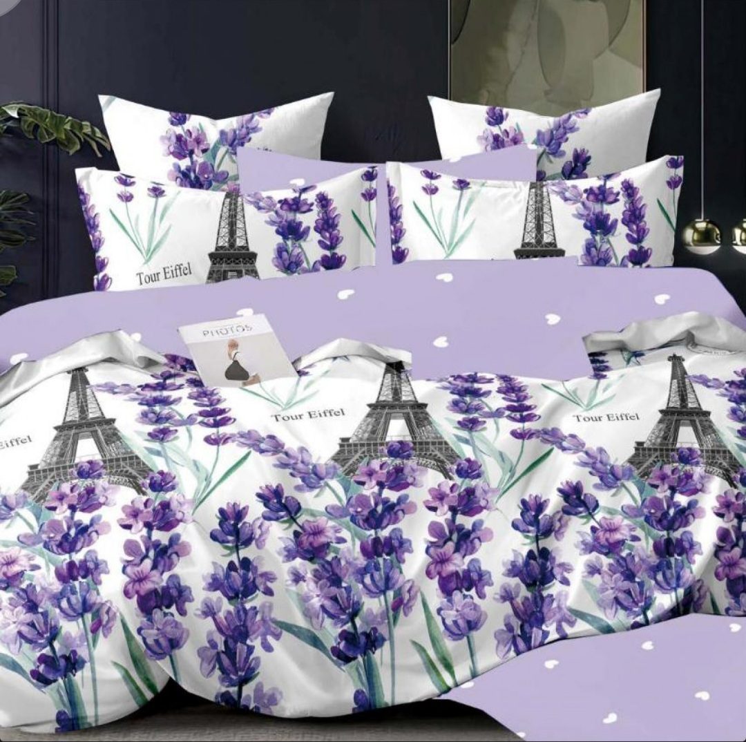 Цвят на чаршафа – лила на сърца , пликът/двулицев/ и калъфките са-бял на мотиви.