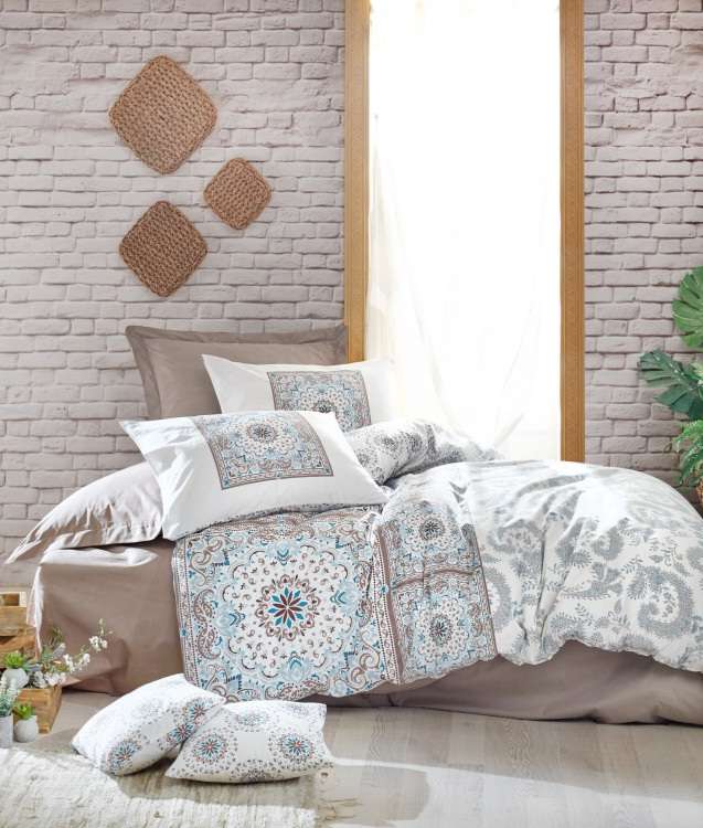 Ликсозен спален комплект бельо на издържаната турска фирма COTTON BOX. Цвят на чаршафа капучино, цвят на плика и калъфките: Комбинация от няколко цвята – бял с орнаменти в цветовете кафяво, капучино и синьо . Комплектът е от серия Бохем.