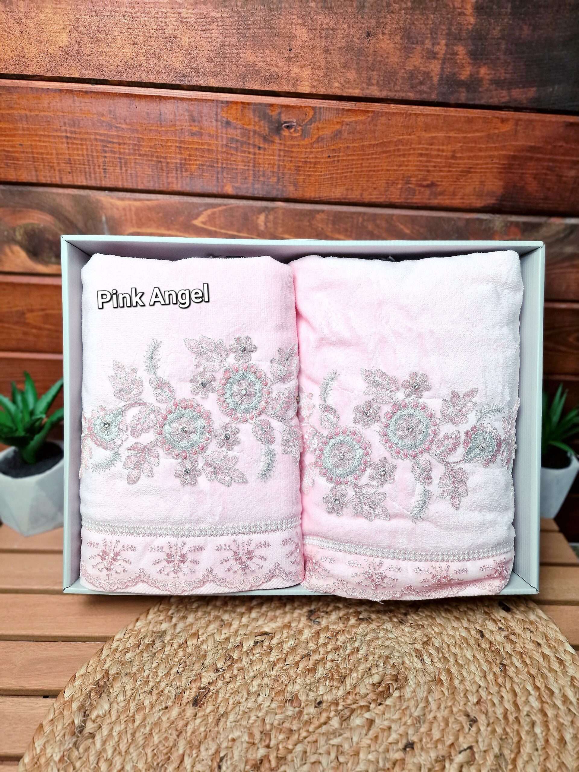 Луксозни хавлиени кърпи с пришита дантела и маниста, 2 броя в луксозна кутия. Изработена от 100 % микропамук 400 гр./м3. Подходящ подарък за всеки празник.