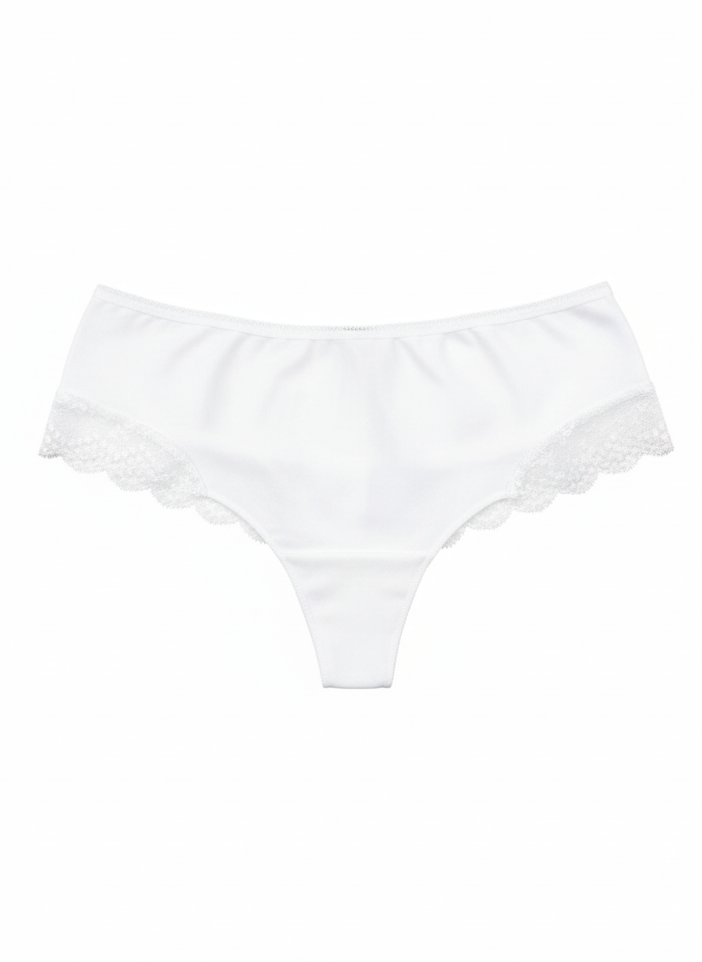 Изключително удобна бразилиана, изработена от фин микрофибър, в комбинация с дантела. Състав: 85% полиамид, 15% еластан, вътрешна част-памук. Дантелата може да бъде с дизайн, различен от този на снимката. Цвят: бяло
