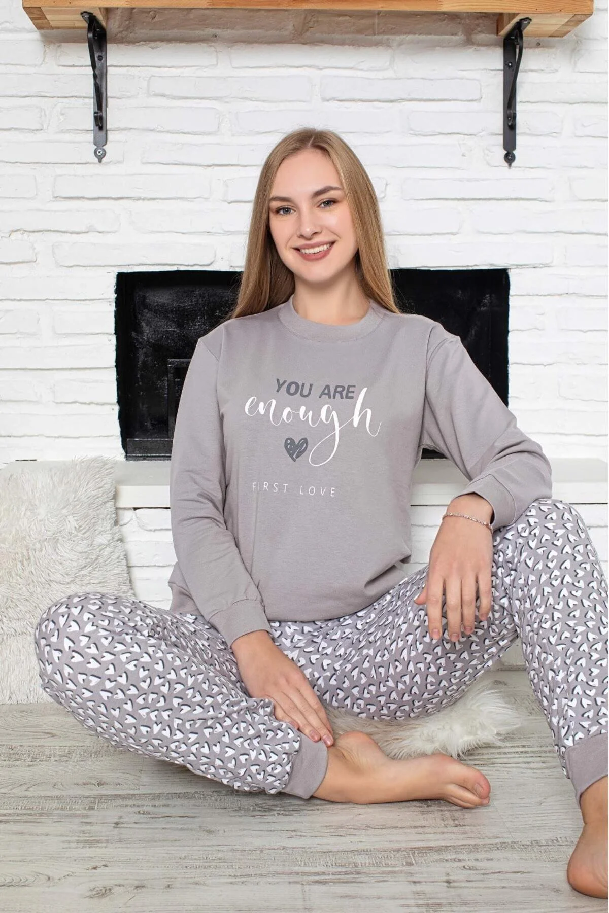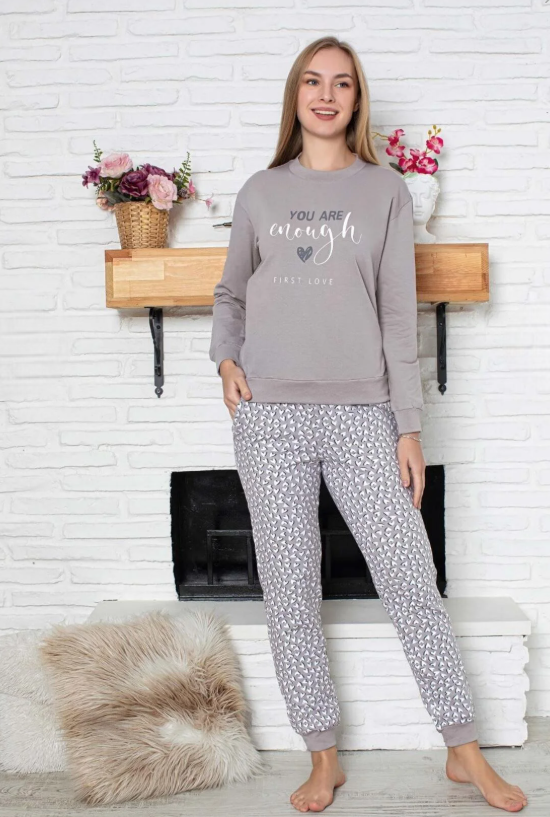 Тази дамска пижама е създадена за максимален уют у дома. Материята е нежна към кожата и осигурява комфорт през студените вечери. Горнището е с дълъг ръкав и нежна щампа, а долнището – с удобна кройка и маншети. Идеален избор за домашен уют и спокоен сън.