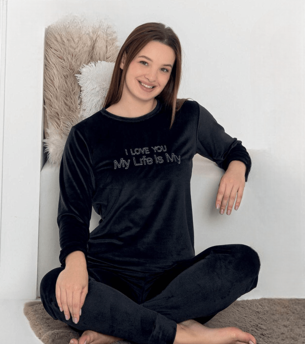 Открийте перфектния баланс между комфорт и елегантност с нашата дамска кадифена пижама. Изработена от висококачествено, меко на допир кадифе, тя осигурява топлина и уют през студените вечери. Горната част е с изчистен дизайн и надпис, а долната част – с удобна кройка и ластичен колан (долнището е с маншети). Идеален избор за стилен домашен комфорт или подарък за специален човек.