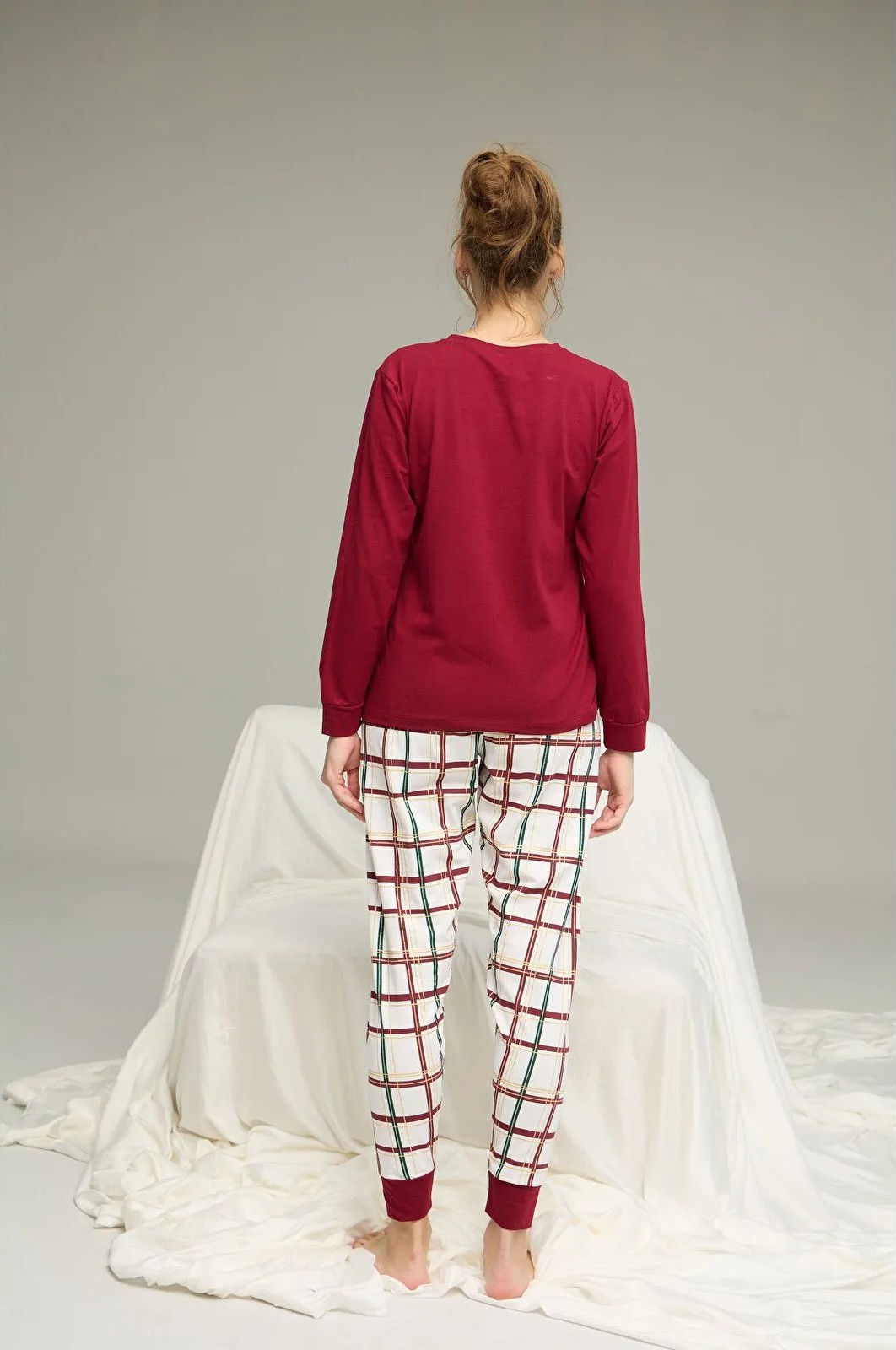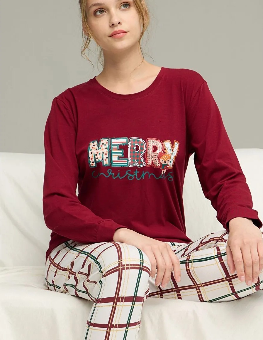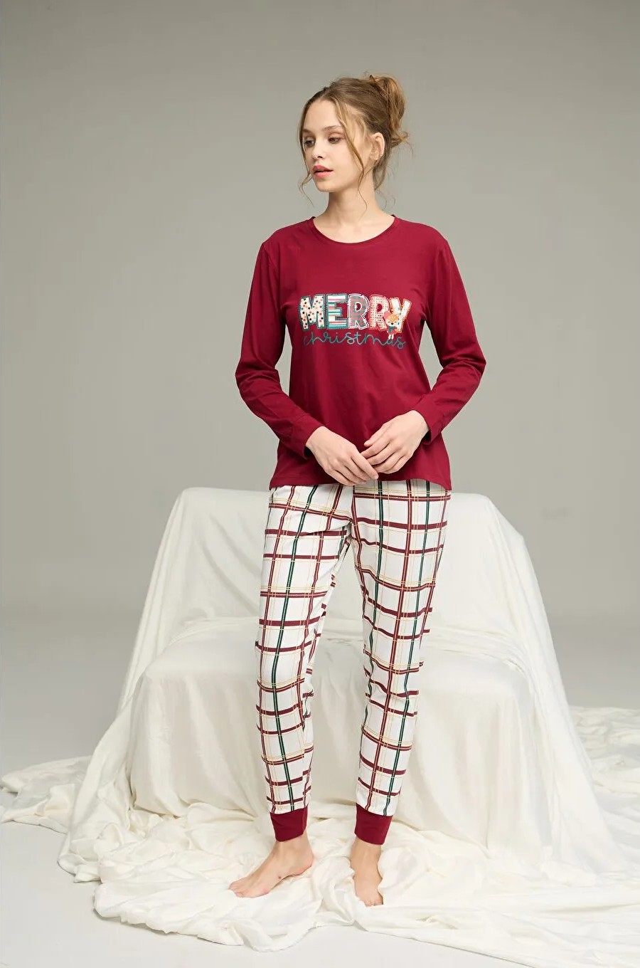 🎄Празнична дамска коледна пижама в стилна комбинация от бордо и бяло с надпис Merry Christmas. Изработена от мек и дишащ памук, тя осигурява комфорт и топлина през студените зимни нощи. Горнището е с дълъг ръкав и коледен дизайн, а долнището – с еластична талия и шарка на каре в червено, зелено и златисто. Перфектна за уютни вечери у дома или като коледен подарък.