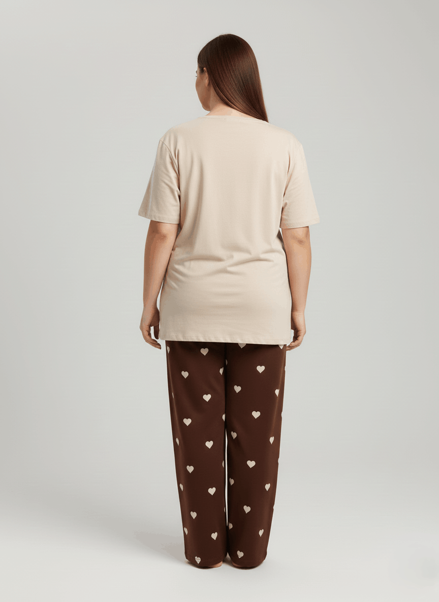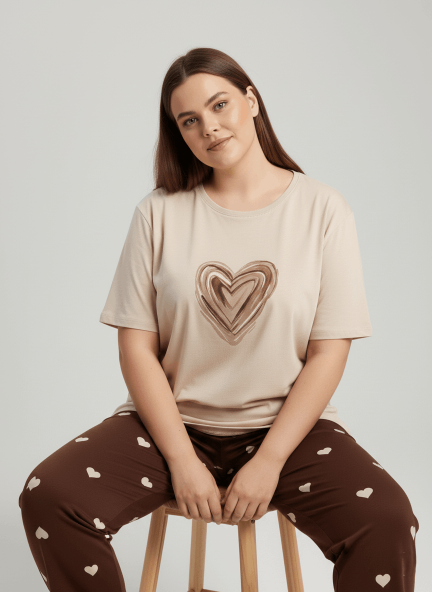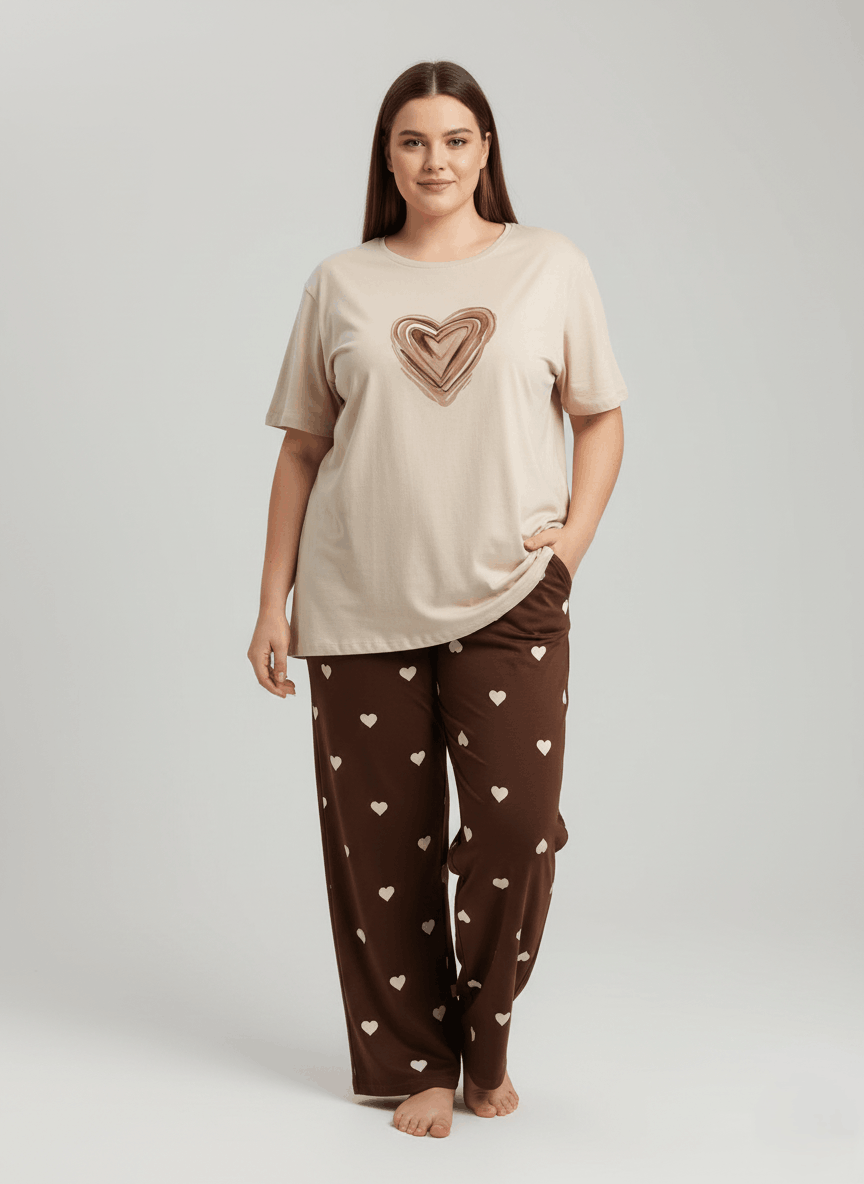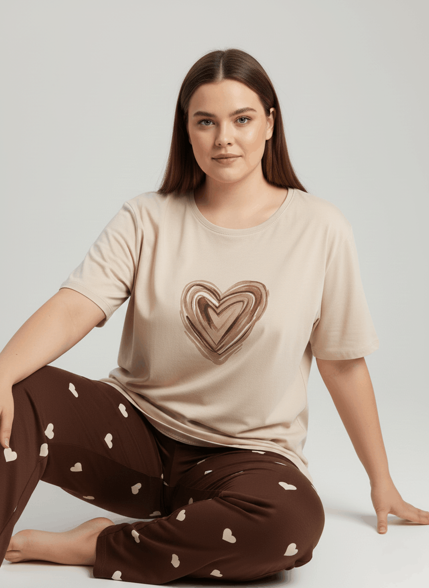 Открий комфорта и стила с тази дамска макси пижама, създадена специално за жени, които ценят удобството без компромис с визията. Комплектът включва свободна тениска с ефектен принт и панталон без маншети. Свободната кройка е подходяща за макси дами, като подчертава силуета по елегантен и ненатрапчив начин. Ластичната талия на панталона гарантира перфектно прилягане и удобство при носене.
