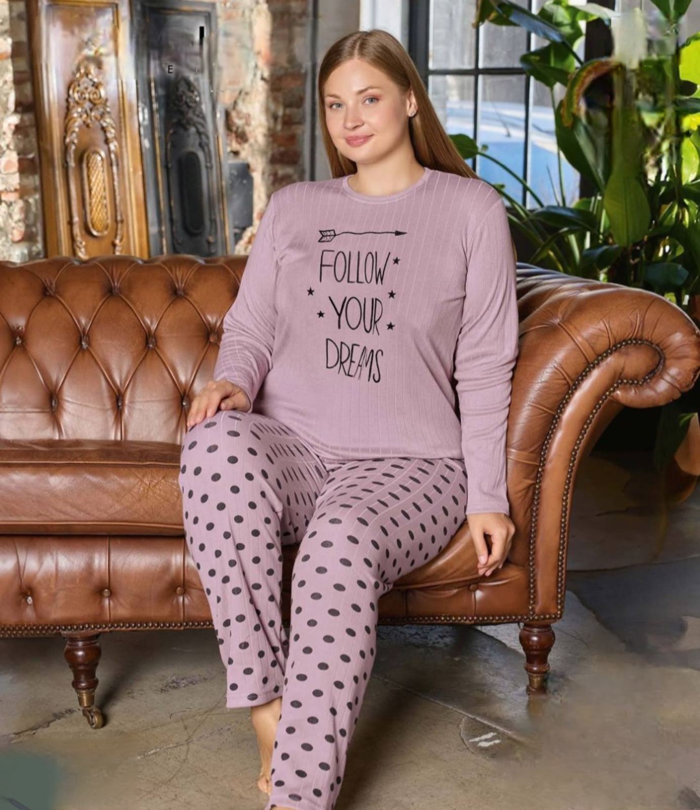 Подарете си уют и топлина с тази пижама изработена от висококачествена и плътна материя, създадена специално за комфорт в по-студените дни. Горнището е с дълъг ръкав. Долнището е с дълъг и свободен панталон (без маншети), ластик в талията и десен – точки.
