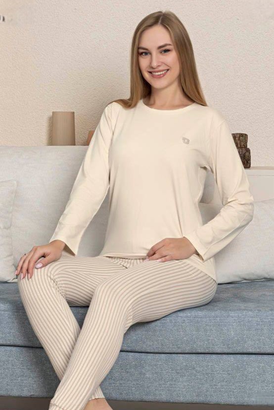 Поглезете се с комфорт и настроение с тази очарователна дамска пижама. Изработена от висококачествен памук, тя е изключително мека, дишаща и приятна на допир, идеална за пълноценен сън и уют у дома. Горнището е с дълъг ръкав и изчистен дизайн. Долнището – с удобна кройка и маншети.