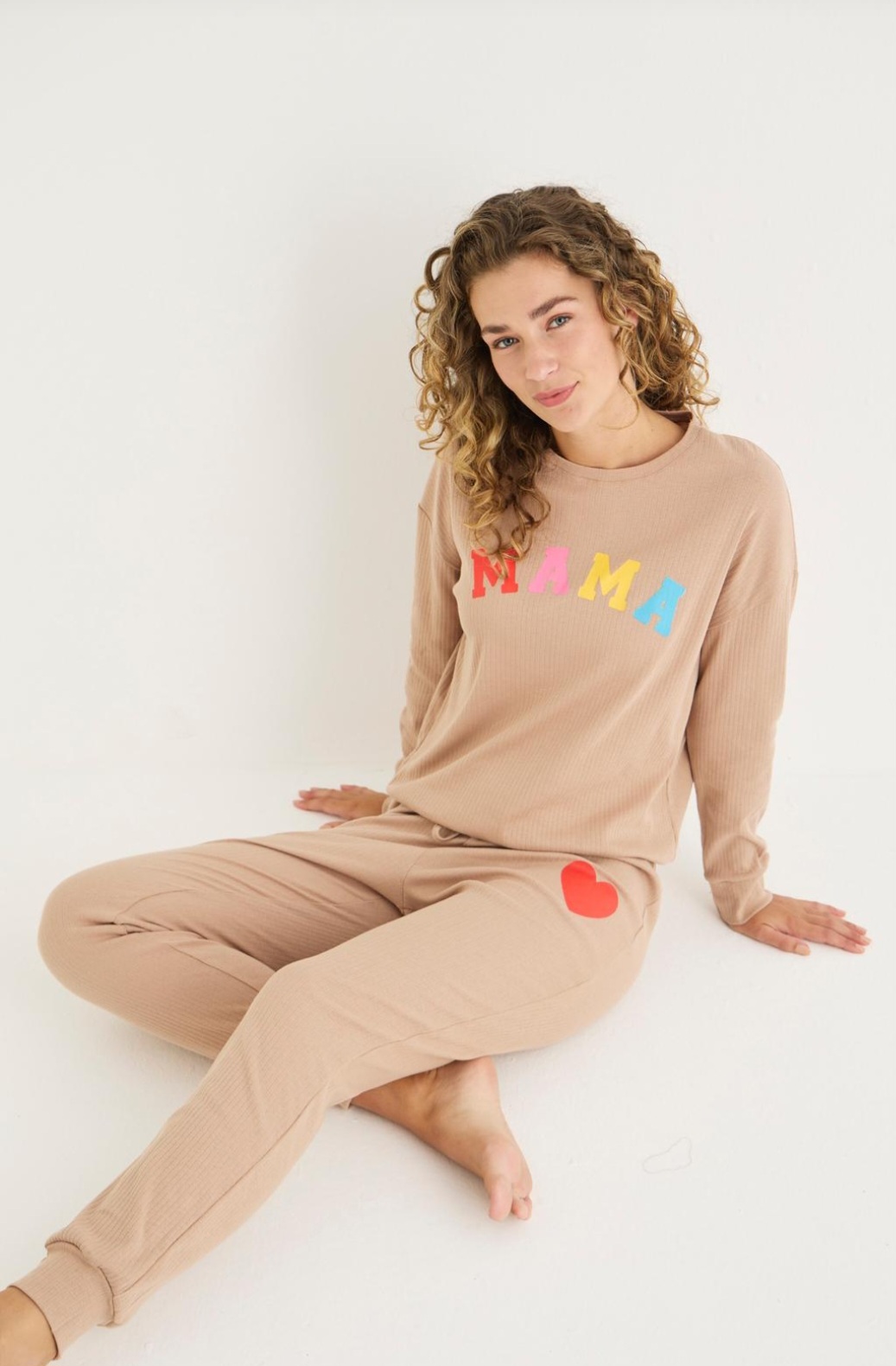 Удобна дамска пижама от мека памучна рипсена материя. Горнището е в бежов цвят с цветен надпис MAMA, а долнището – с червено сърце за нежен акцент. Идеална за сън или релакс у дома. Комфорт, стил и топлина в едно!