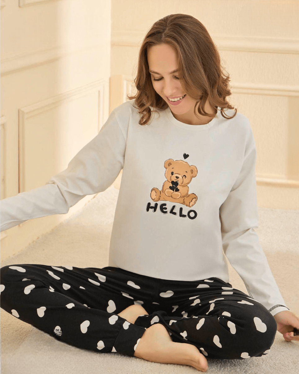 Удобна дамска памучна пижама, изработена от мек и дишащ памук за максимален комфорт по време на сън. Горнището е с дълъг ръкав и забавен принт, а долнището е с десен на сърчица върху черен фон (с маншети). Идеална за уютни вечери у дома и спокоен сън. Перфектен избор за всеки сезон.