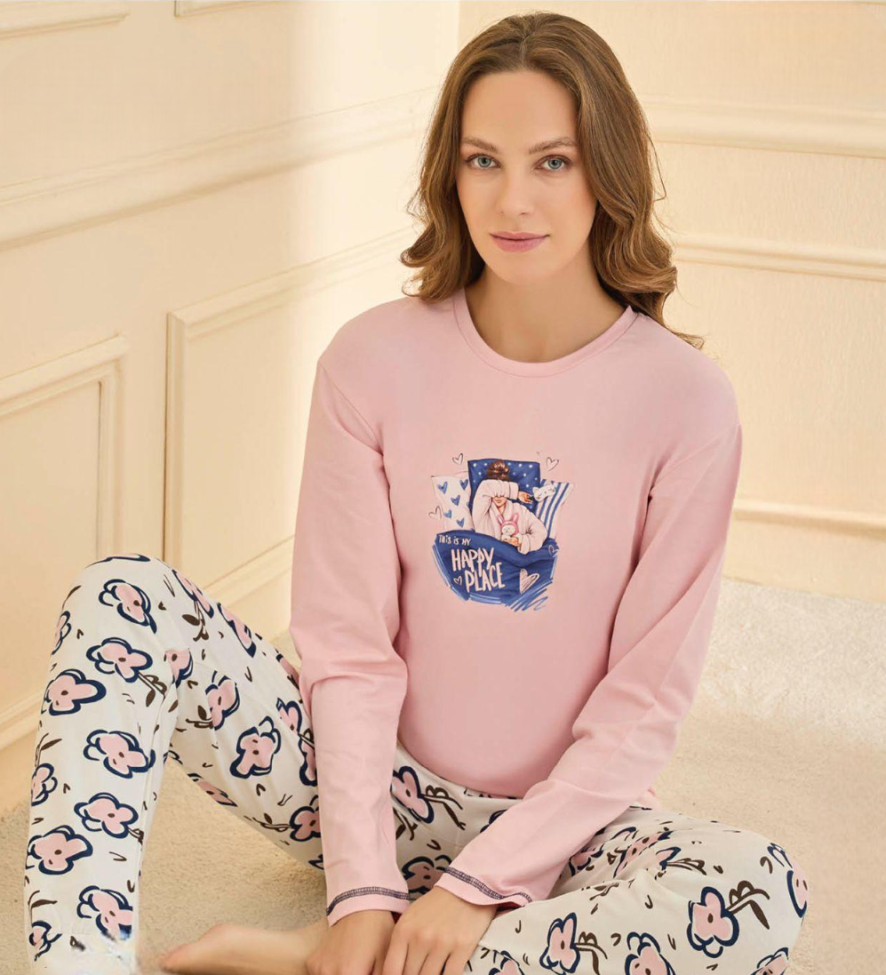 Дамска памучна пижама с дълъг ръкав и сладък принт. Мека, удобна и идеална за уютни нощи у дома.