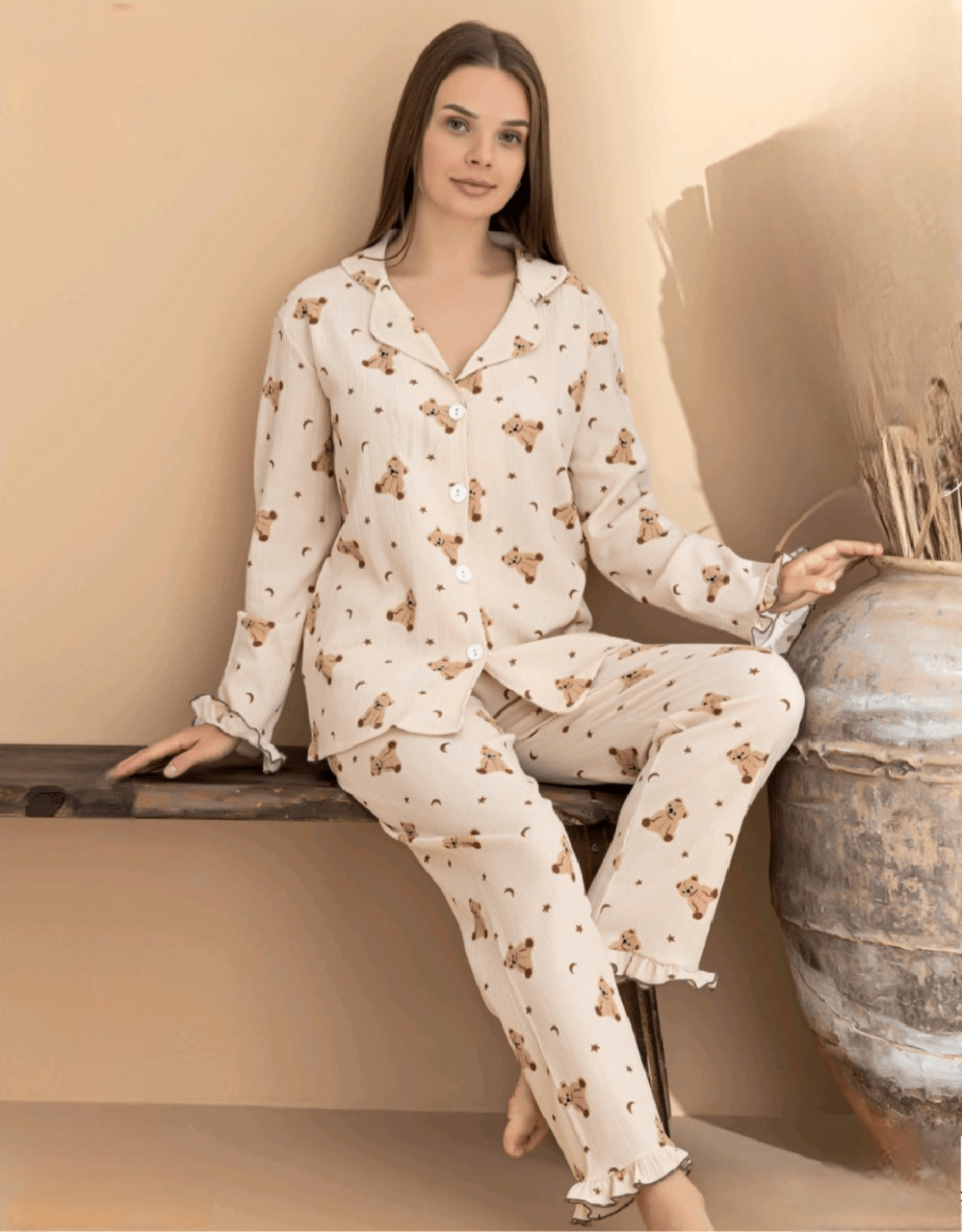 Подарете си комфорт и романтика с тази дамска пижама. Материята е лека, мека и деликатна на допир, с фина релефна (намачкана) текстура, която придава стилен и небрежен вид. Тя е дишаща и приятна за кожата, идеална за комфорт по време на сън и почивка. Моделът включва дълъг ръкав и дълъг панталон с ефектни къдри и сладък десен на мечета.