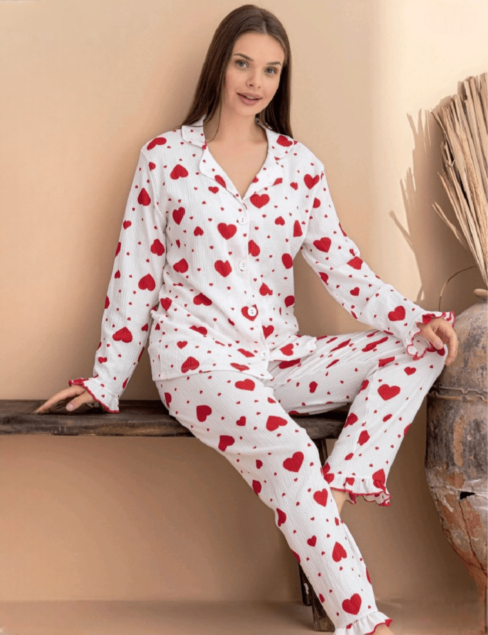Подарете си комфорт и романтика с тази дамска пижама. Материята е лека, мека и деликатна на допир, с фина релефна (намачкана) текстура, която придава стилен и небрежен вид. Тя е дишаща и приятна за кожата, идеална за комфорт по време на сън и почивка.Моделът включва дълъг ръкав и дълъг панталон с ефектни къдри и сладък десен с червени сърца.