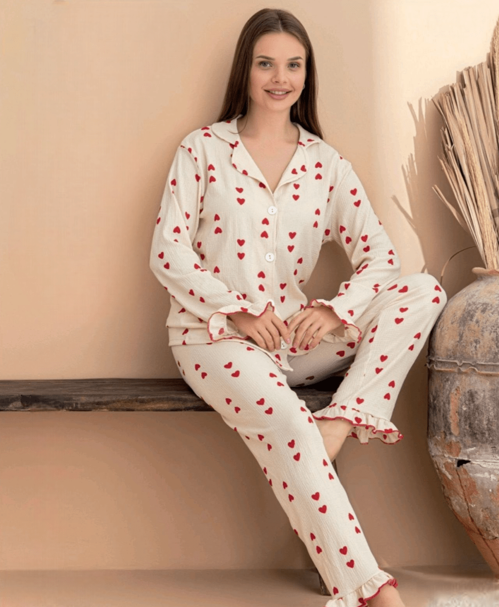 Подарете си комфорт и романтика с тази дамска пижама. Материята е лека, мека и деликатна на допир, с фина релефна (намачкана) текстура, която придава стилен и небрежен вид. Тя е дишаща и приятна за кожата, идеална за комфорт по време на сън и почивка.Моделът включва дълъг ръкав и дълъг панталон с ефектни къдри и сладък десен с червени сърца.