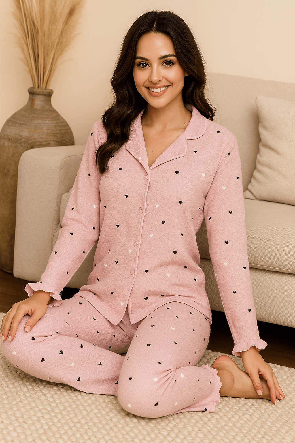 Наслади се на максимален комфорт и стил с тази модерна дамска пижама, дизайн тип вафла. Изработена от плетена материя, която задържа топлината и осигурява максимален комфорт по време на сън или почивка у дома. Комплектът включва горнище с копчета и дълъг ръкав, съчетана с удобен дълъг панталон с ластична талия. Романтичният десен със сърчица и къдриците в края на ръкавите и долнището придават свежо и женствено излъчване, а свободната кройка осигурява комфорт през цялото време.