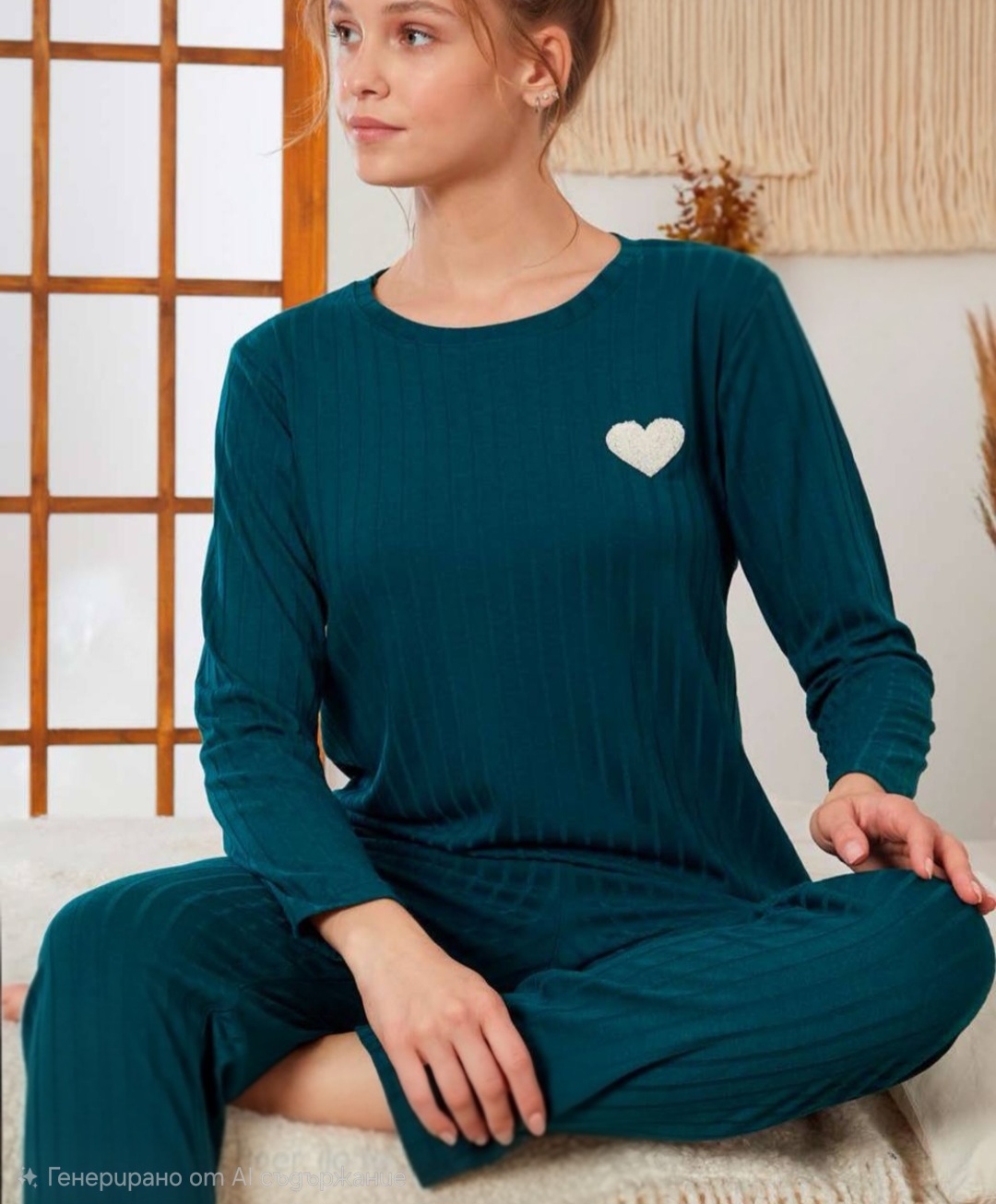 ✨ Дизайн: Горнището е с дълъг ръкав и апликация, а долнището е с дълъг прав панталон (без маншет)