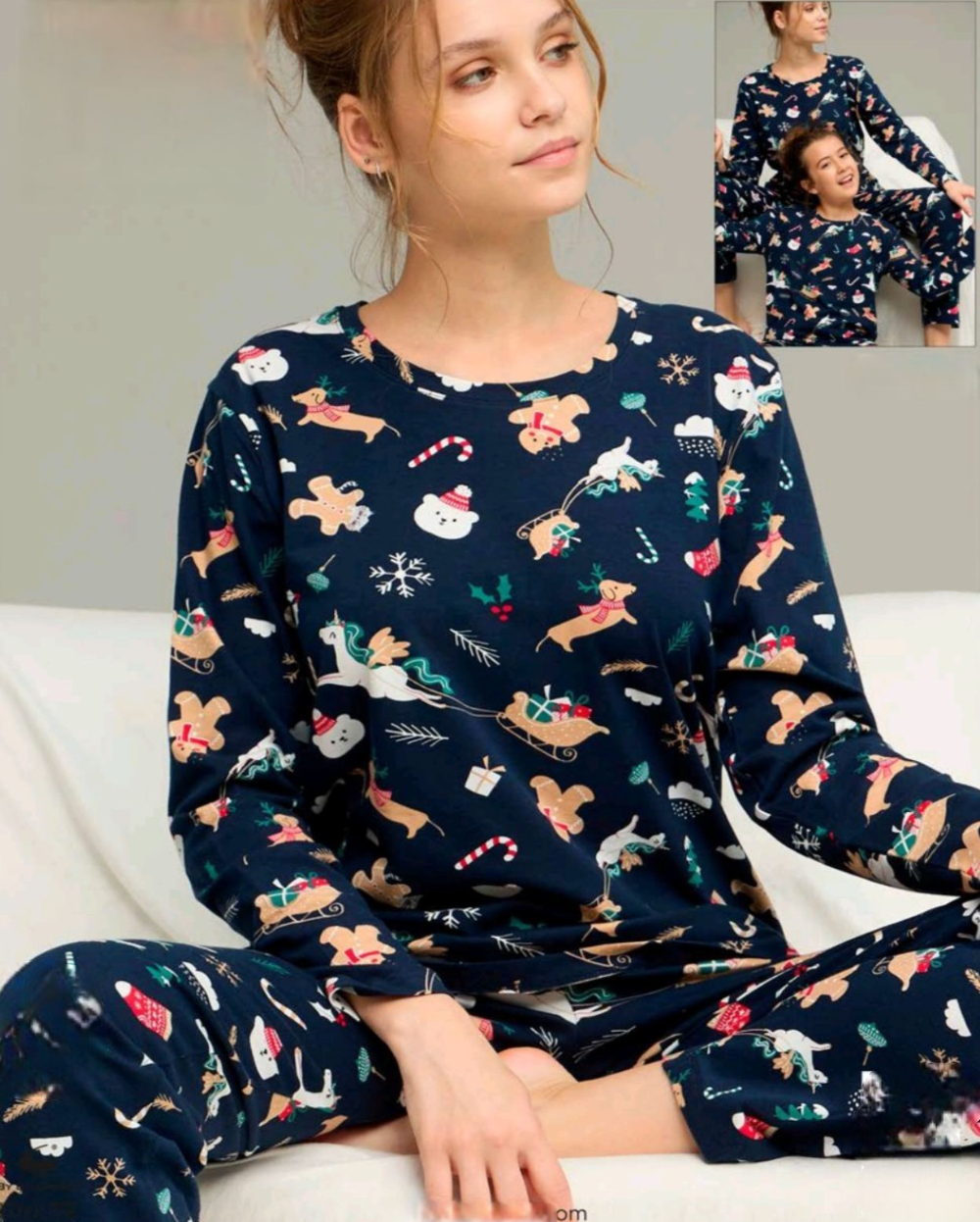 🎄 Дамска коледна пижама в тъмносин цвят с весели празнични мотиви. Мека, топла и удобна – идеална за уютни зимни вечери. Моделът може да се комбинира с детска пижама в същия десен – идеален избор за стилен семеен сет.