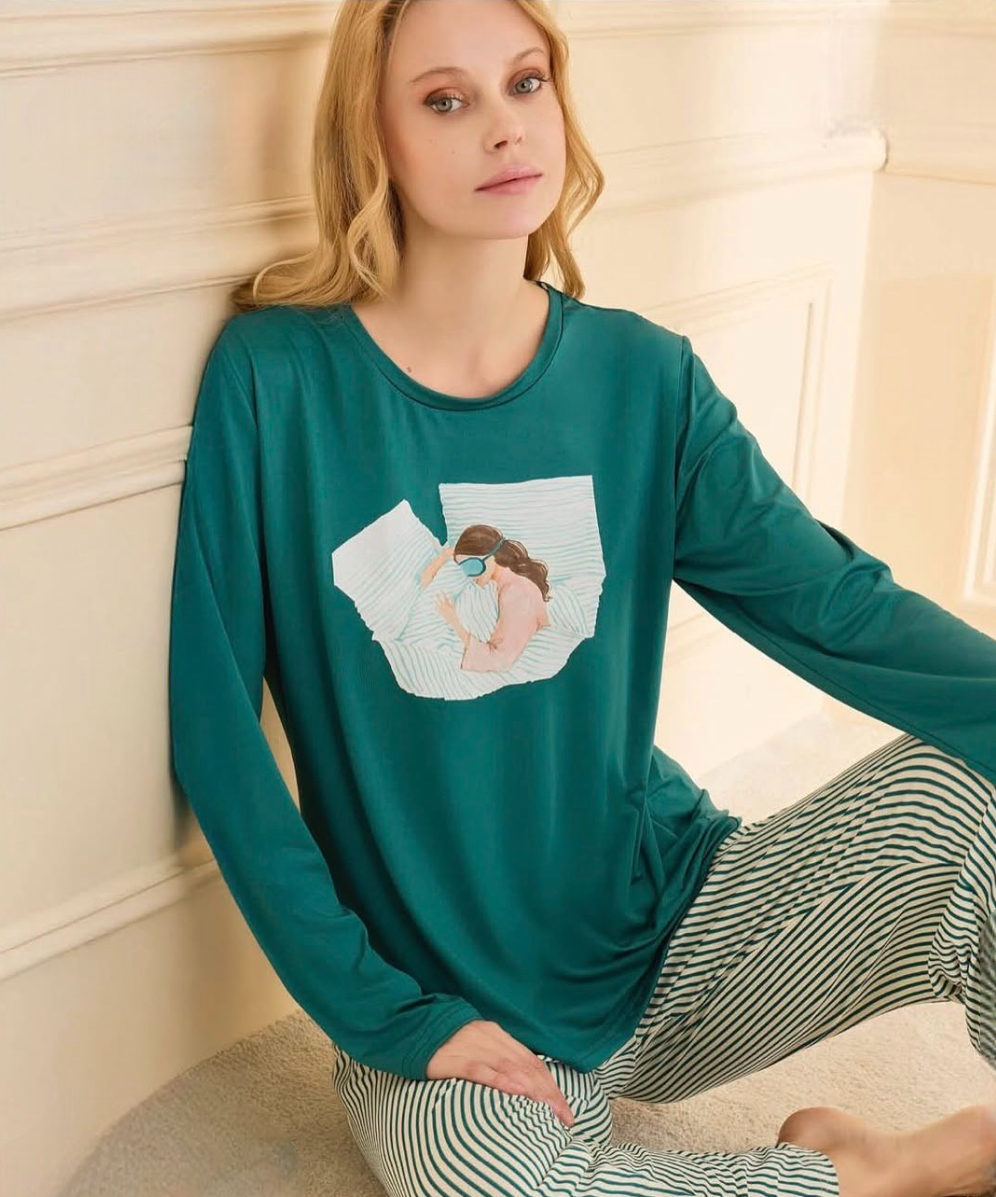 Дамска пижама от две части. Изработена от висококачествена материя, тя е едновременно удобна и еластична. Горнището е с дълъг ръкав и щампа. Долнището е с дълъг панталон без маншети.