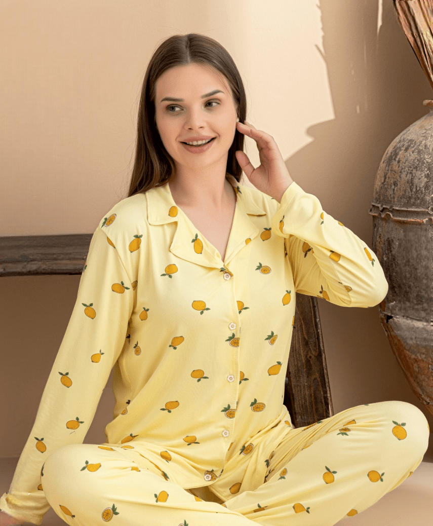 Удобна и стилна дамска пижама. Горната част е с класическа кройка – копчета отпред, яка и дълги ръкави, а долната част са удобни панталони с ластик на талията (без маншет) . Дизайнът е с десен на лимони.