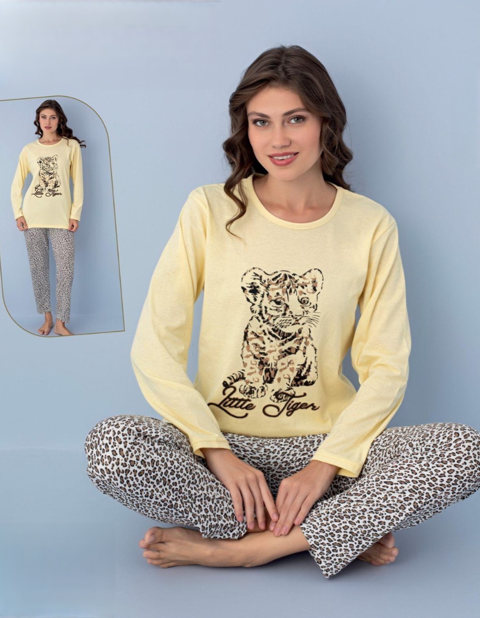 Дамска пижама от две части с щампа . Горнището е с дълъг ръкав, обло деколте . Долнището е с дълъг крачол, без маншет.