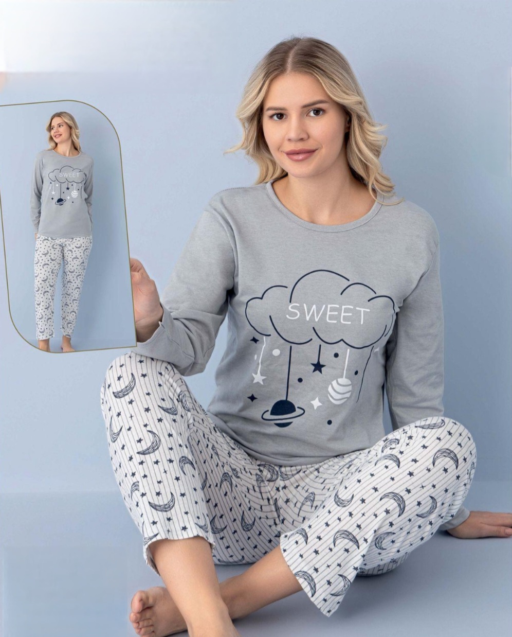 Дамска пижама от две части с щампа . Горнището е с дълъг ръкав, обло деколте . Долнището е с дълъг крачол, без маншет.