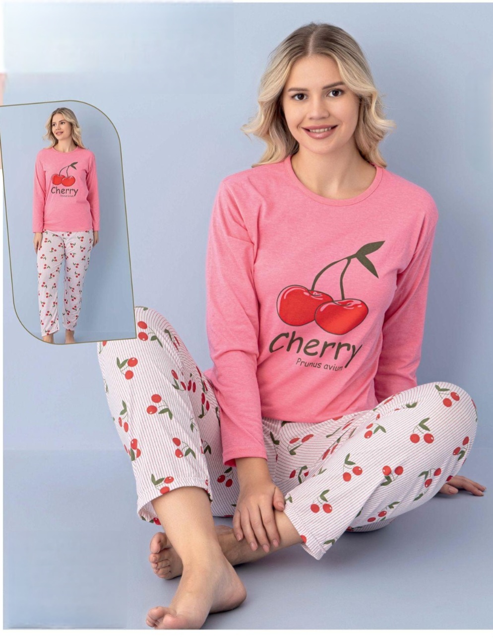 Дамска пижама от две части с щампа . Горнището е с дълъг ръкав, обло деколте . Долнището е с дълъг крачол, без маншет.