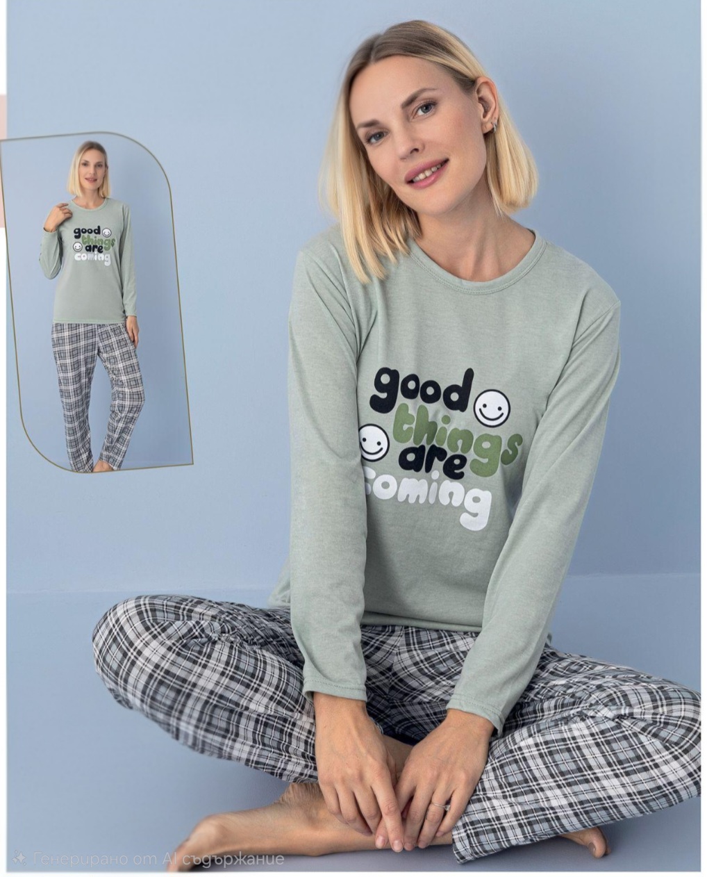 Дамска пижама от две части с щампа . Горнището е с дълъг ръкав, обло деколте . Долнището е с дълъг крачол, без маншет.