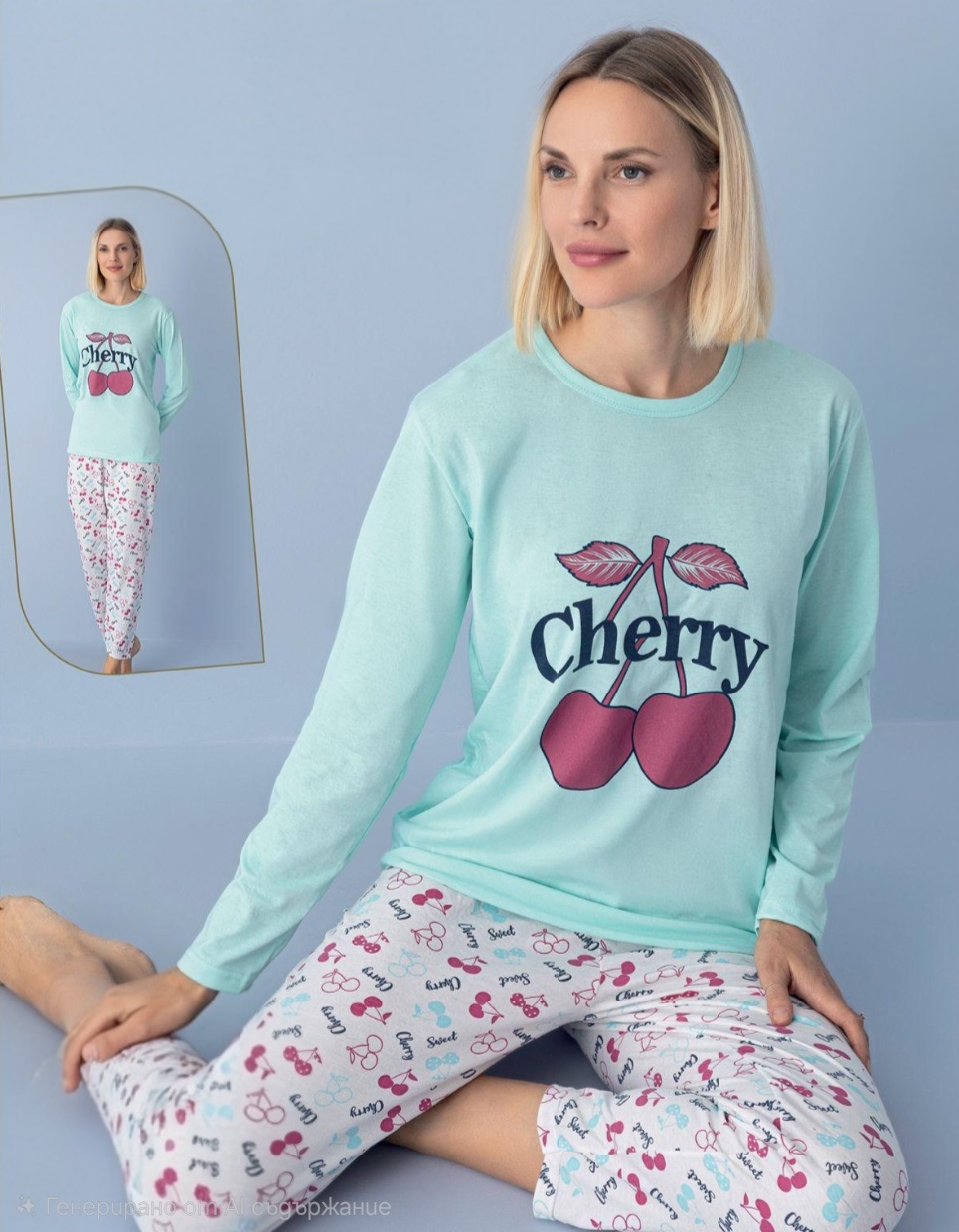 Дамска пижама от две части с щампа . Горнището е с дълъг ръкав, обло деколте . Долнището е с дълъг крачол, без маншет.