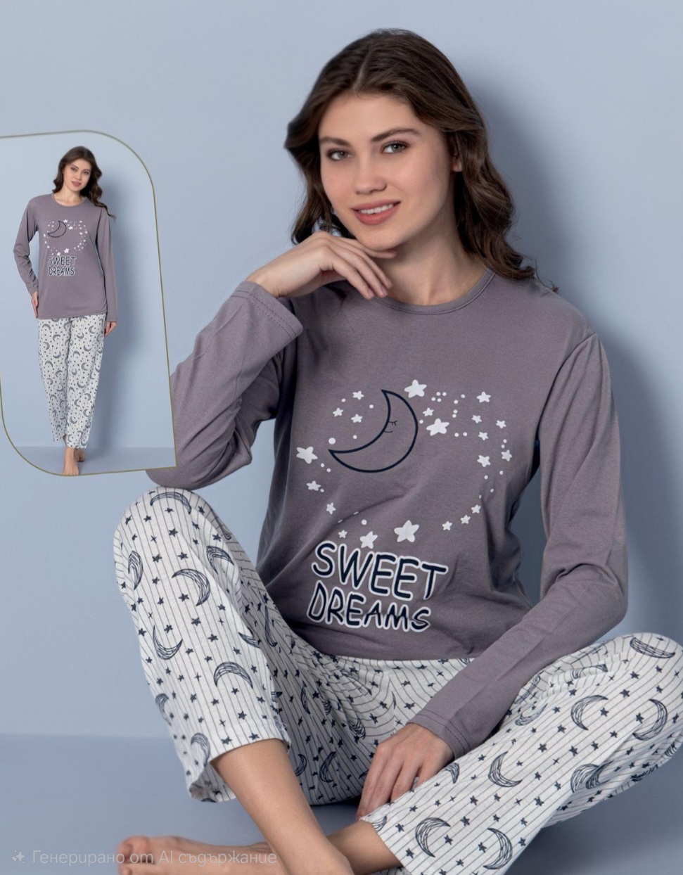 Дамска пижама от две части с щампа . Горнището е с дълъг ръкав, обло деколте . Долнището е с дълъг крачол, без маншет.