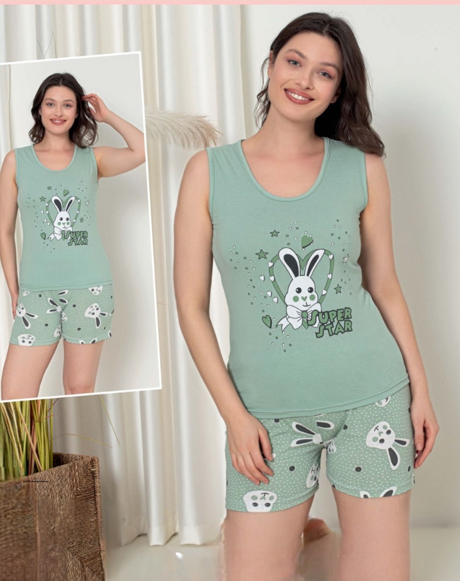 Дамска пижама от две части. Горнището е потник с дебели презрамки, обло деколте и щампа. Долнището е с къс крачол.