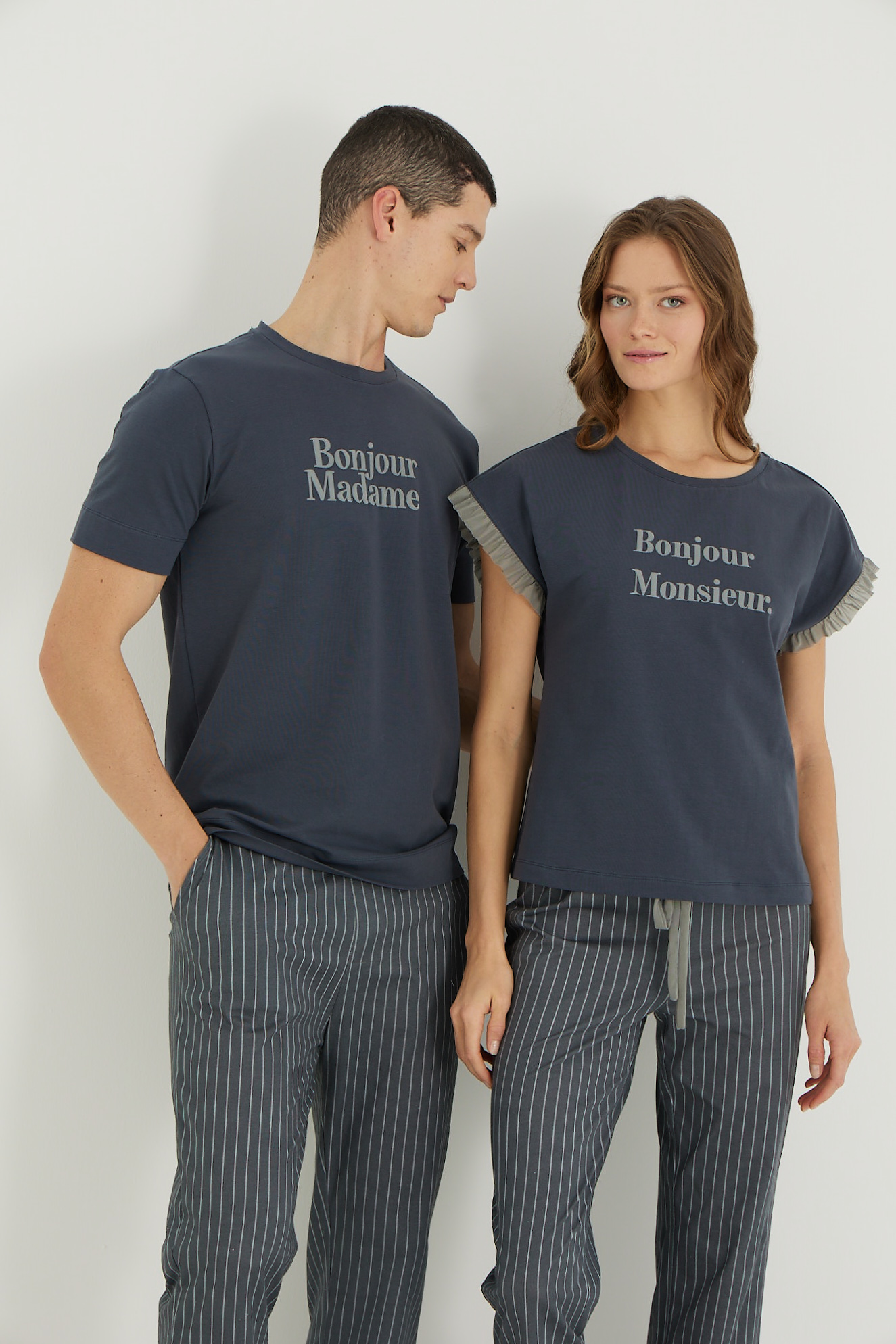Горнището е с къс ръкав . Панталонът е дълъг, с еластичен колан на талията.