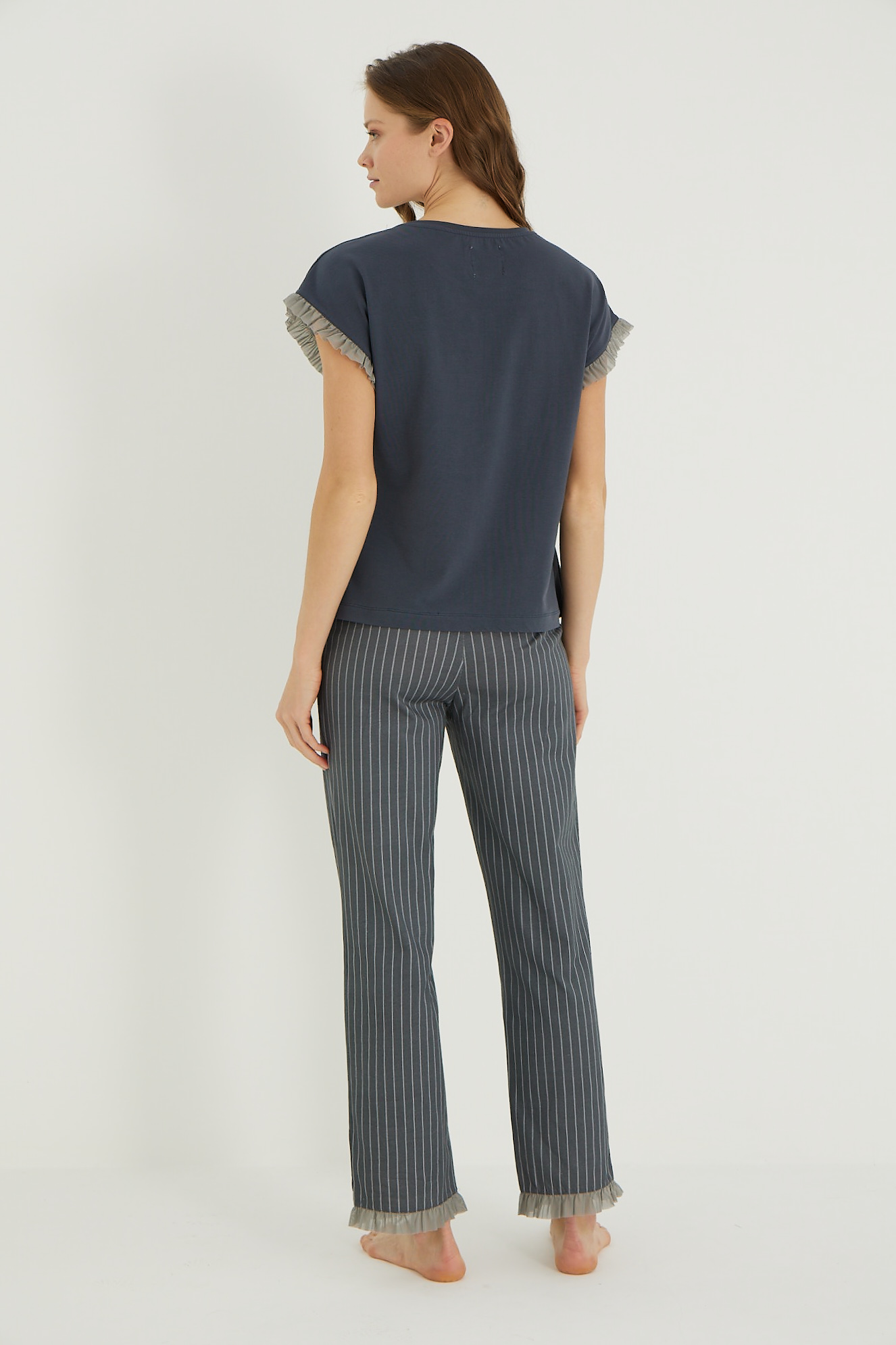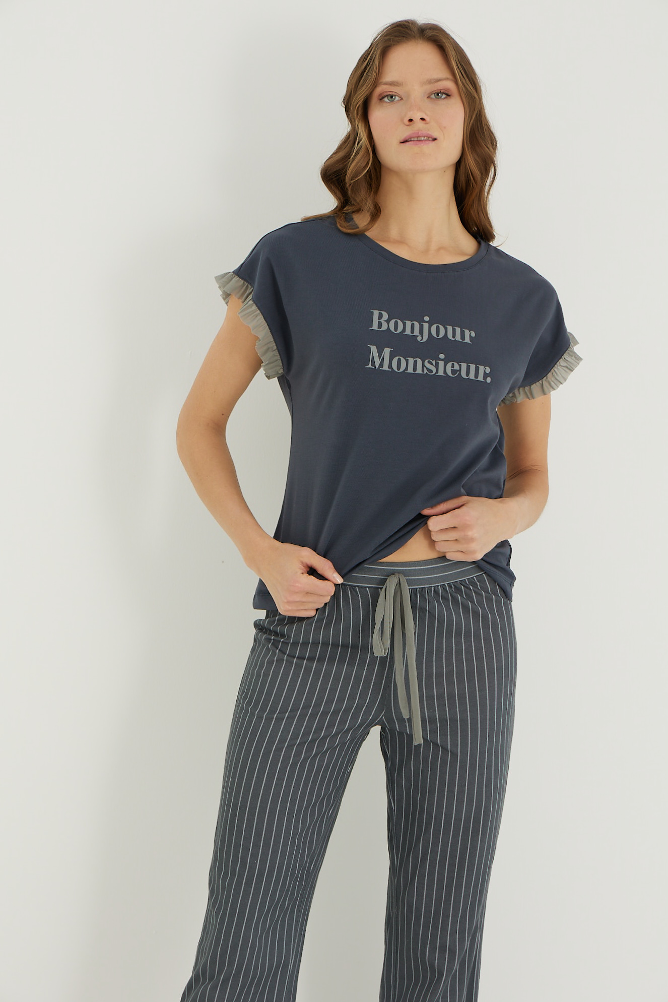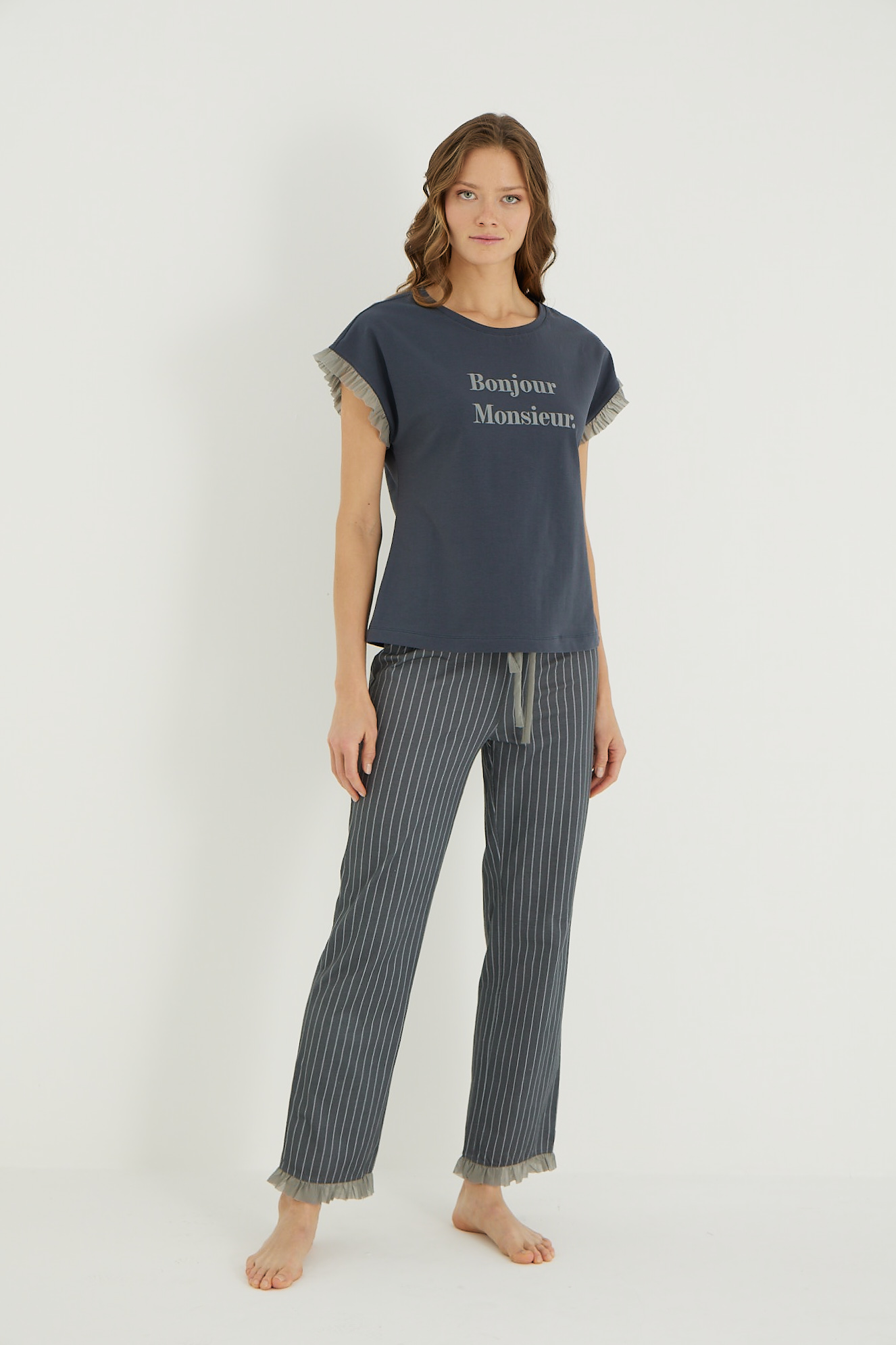 Дамската пижама с къс ръкав и дълъг панталон.