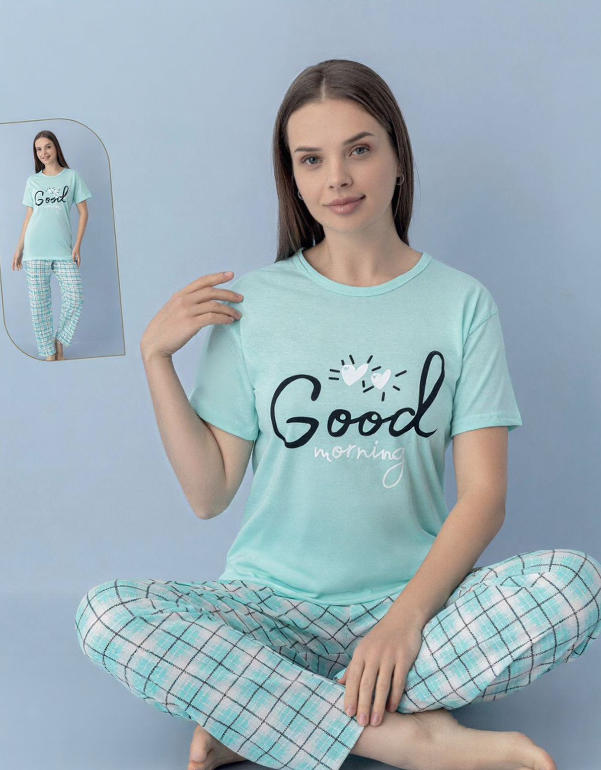 Дамска пижама от 100% памук, създадена за жени, които ценят комфорта и практичността. Благодарение на естествената материя, пижамата е мека и нежна към кожата, позволява свободно движение и осигурява спокоен сън.