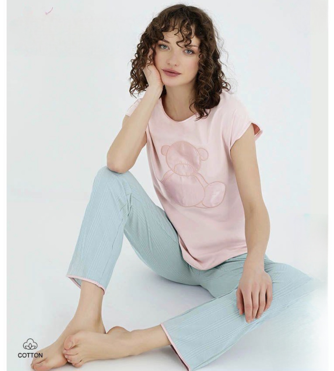 Дамската пижама с къс ръкав и дълъг панталон.Има сатенена апликация.