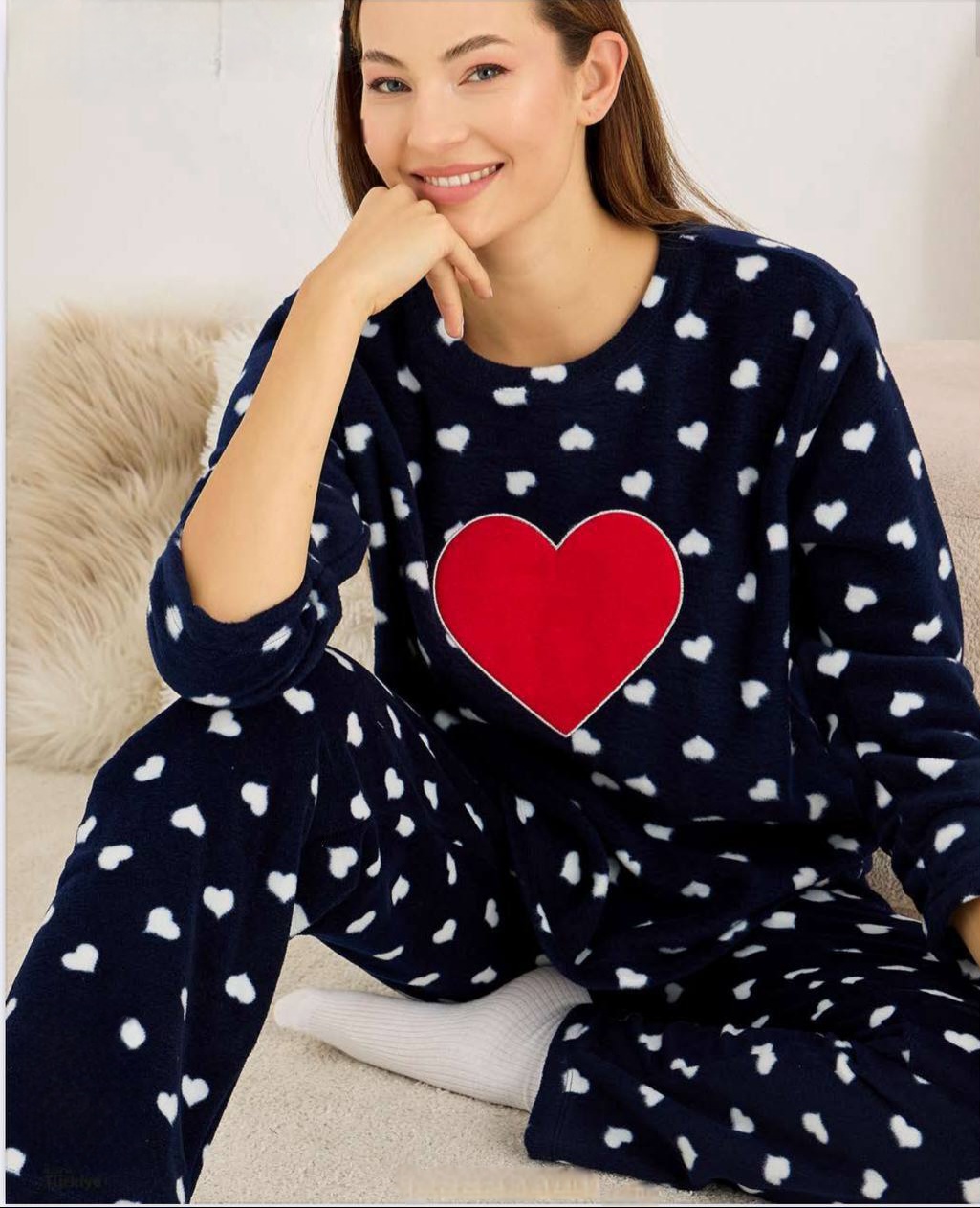 Топла дамска пижама в две части . Изработена от висококачествен полар . С апликация. Горнището е от полар и е без маншет.  Долнището е без маншет от полар.