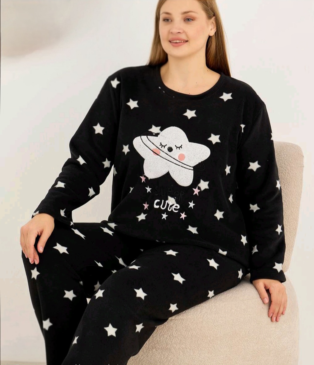 Топла дамска макси пижама в две части . Изработена от висококачествен полар . С апликация. Горнището е от полар и е без маншет. Долнището е без маншет от полар.
