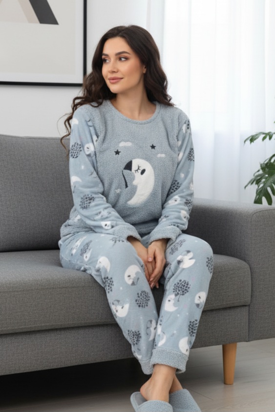 Горнището е с дълъг ръкав и сладка апликация. Долнището е с маншет. Пижамата осигурява топлина и комфорт през студените вечери. Подходяща е както за сън, така и за уютни моменти у дома.