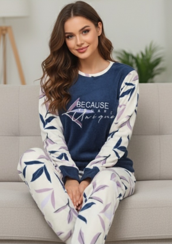 Топла дамска пижама в две части . Изработена от висококачествен велсофт и полар . С апликация. Горнището е от полар. Долнището е без маншет от полар.