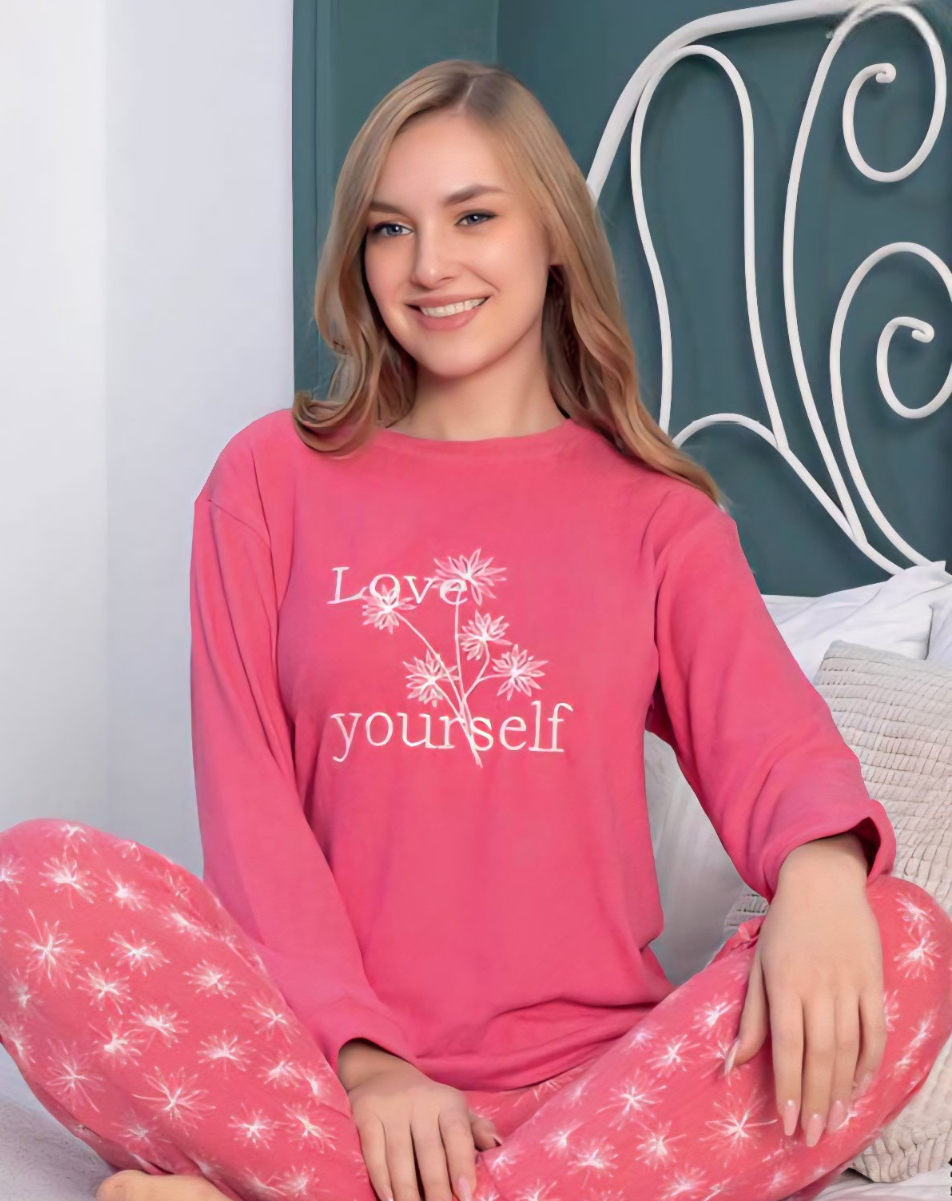 Топла термална пижама – идеален избор за студените зимни вечери. Изработена от фино плетена материя, която задържа топлината и осигурява максимален комфорт по време на сън или почивка у дома. Горнището е с дълъг ръкав, а долнището с дълъг крачол и маншети. Апликациите по нея придават свежест и настроение. Пижамата е мека, удобна и дишаща, което я прави подходяща както за нощен сън, така и за уютни моменти у дома.