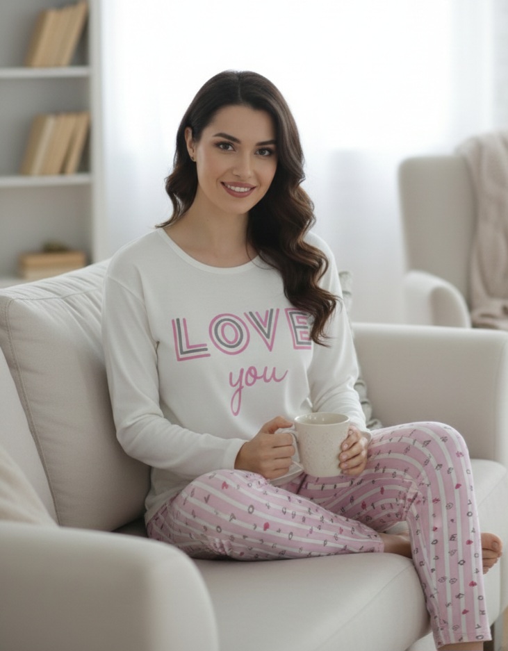 Подарете си топлина и комфорт с тази очарователна дамска пижама, изработена от плътна и мека памучна материя (интерлог), идеална за зимния сезон. Горнището е с дълъг ръкав и щампа. Долнището е дълъг панталон без маншет.