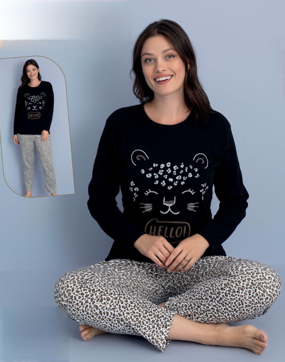 Подарете си топлина и комфорт с тази очарователна дамска пижама, изработена от плътна и мека памучна материя (интерлог), идеална за зимния сезон. Горнището е с дълъг ръкав и щампа. Долнището е дълъг панталон без маншет.