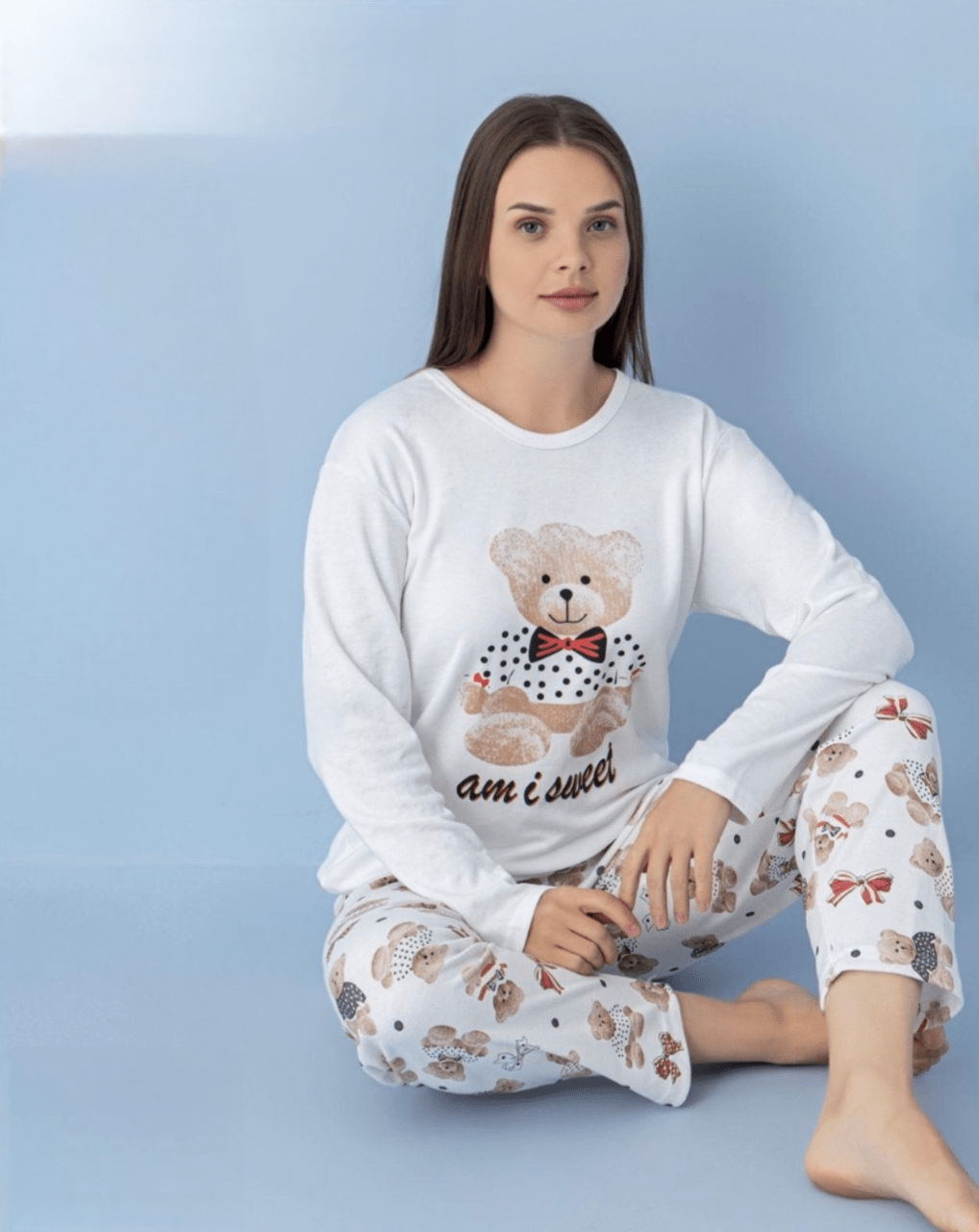 Подарете си топлина и комфорт с тази очарователна дамска пижама, изработена от плътна и мека памучна (интерлог) материя, идеална за зимния сезон. Горнището е с дълъг ръкав и щампа на мече. Долнището е с дълъг панталон(без маншети) с десен на мечета.